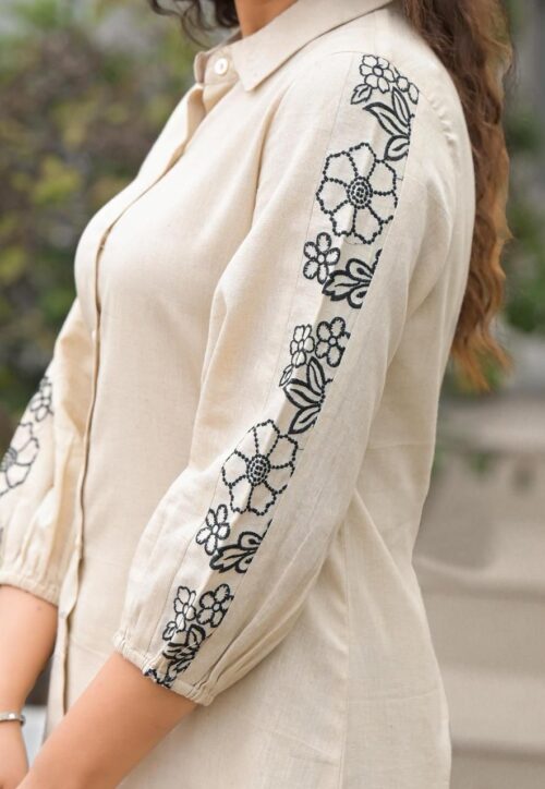 • A crisp button‑down shirt with subtle black floral embroidery on the sleeves