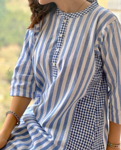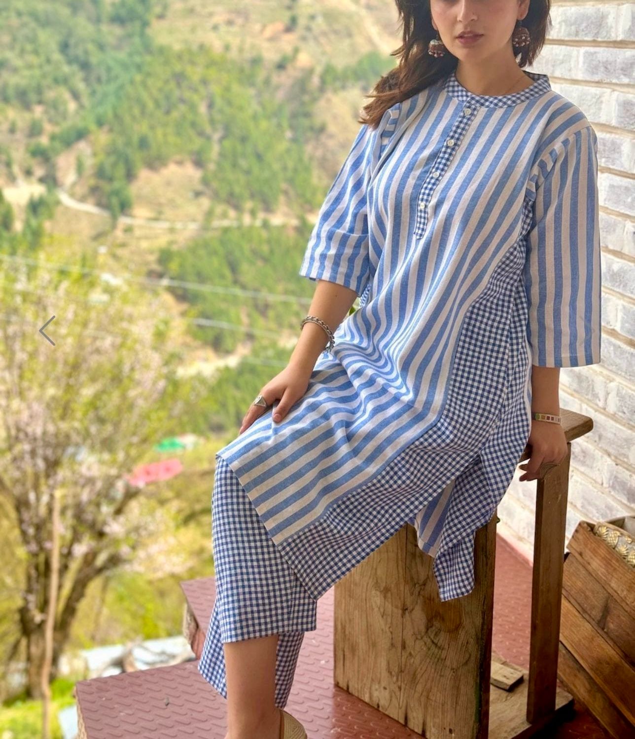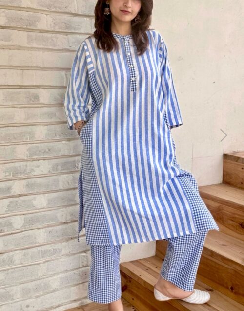 Stay cool and stylish in this Blue Breeze Kurti Pant Set, made from soft and breathable cotton fabric. Featuring a trendy mix of stripes and checks in blue and white, this comfy co-ord is perfect for everyday wear.