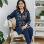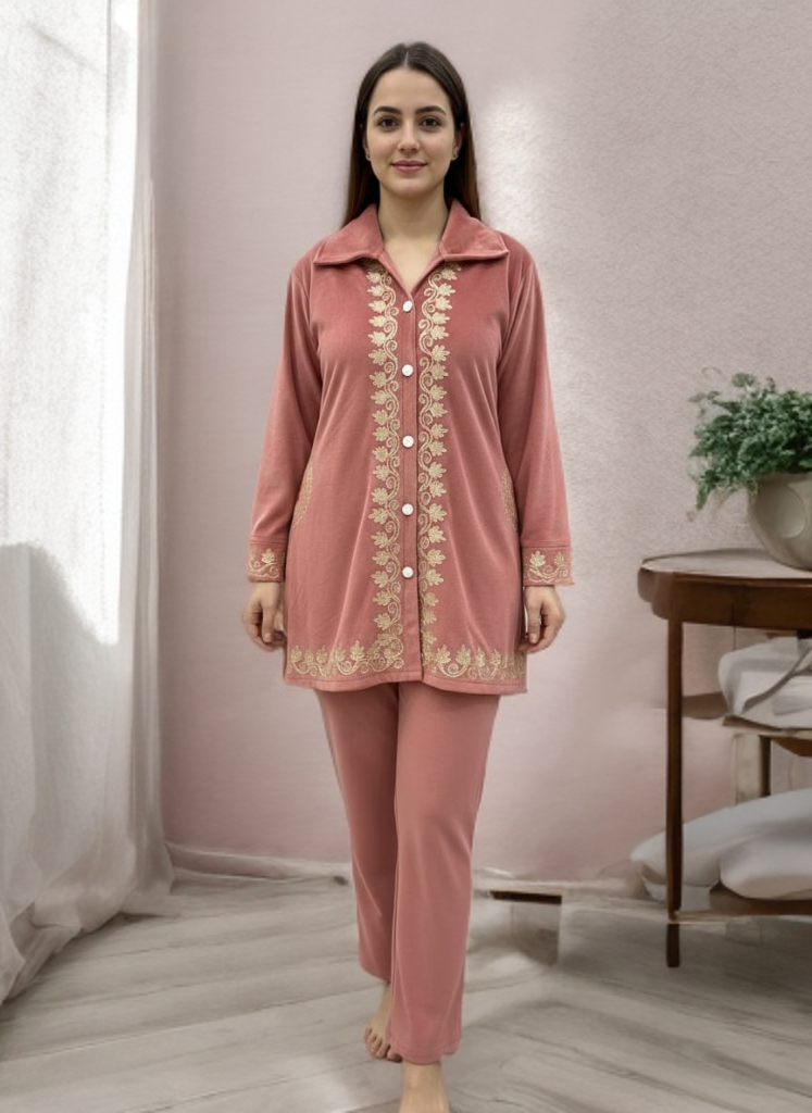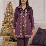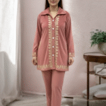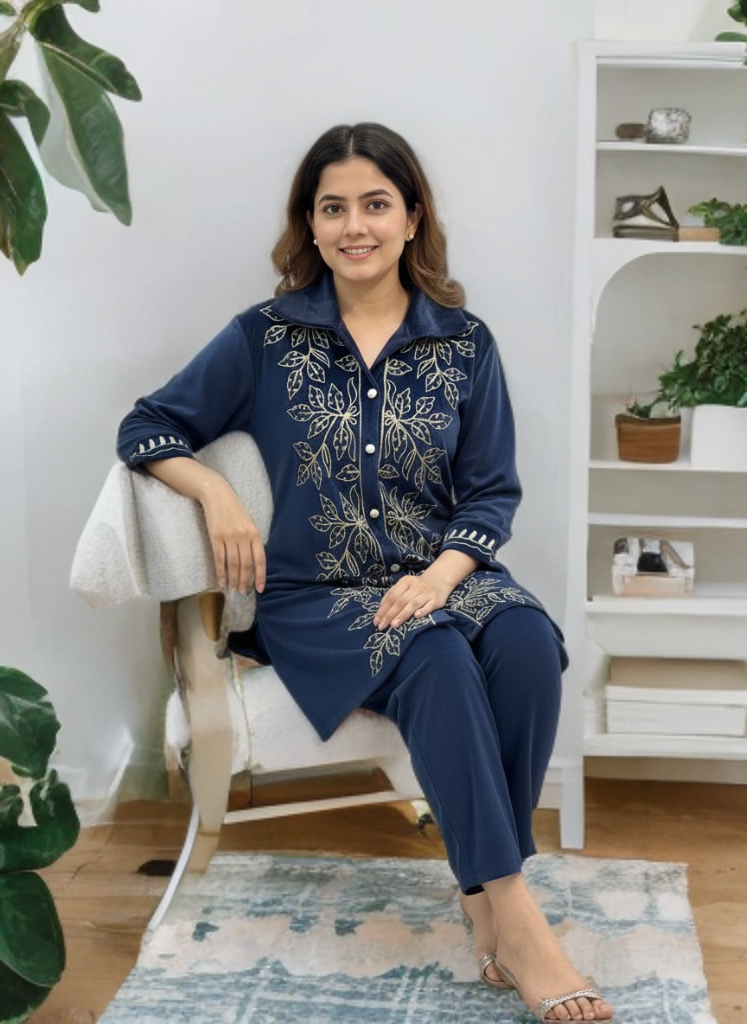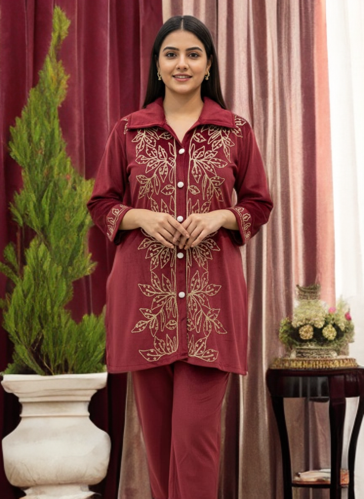 Stay cozy and stylish this season with our luxurious velvet co-ord set, beautifully crafted with intricate aari embroidery on the neck and sleeves. The chic cool-collar design adds a modern touch, making this outfit perfect for winter outings, festive gatherings, or elegant evenings.