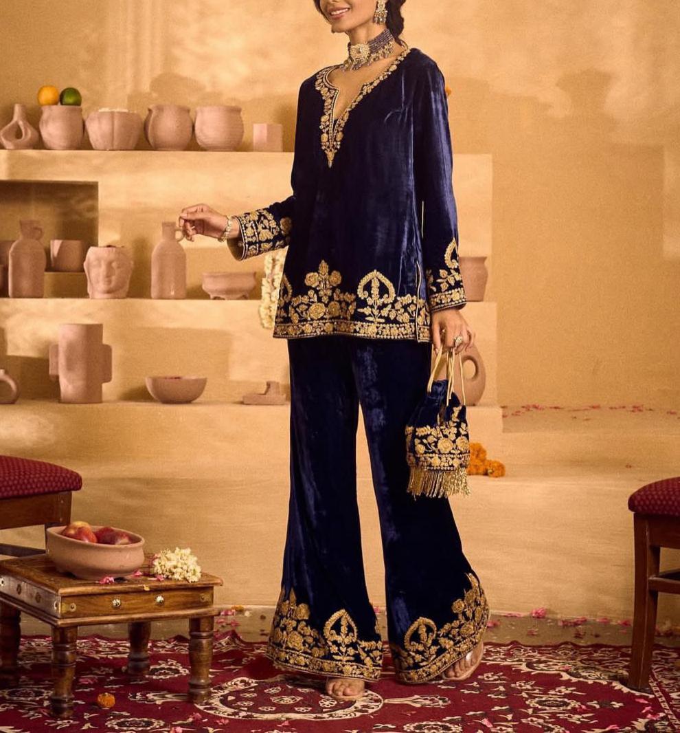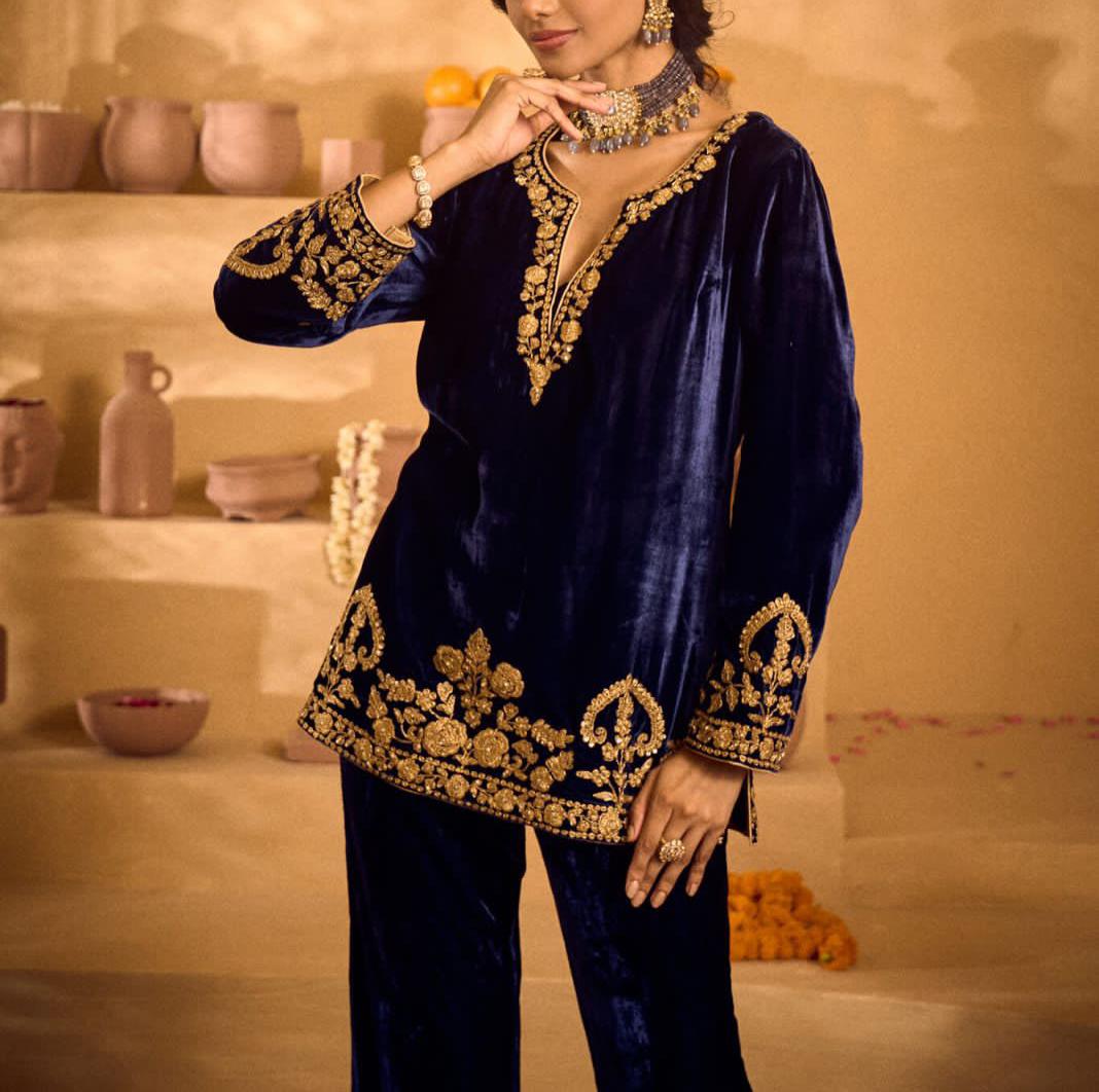 Step into elegance with our premium Viscous Velvet Co-ord Set, featuring rich embroidery, a soft micro-cotton lining, and a beautifully crafted matching potli. This ready-to-wear set offers perfect winter comfort with a luxurious festive look.