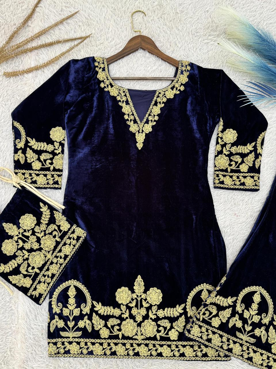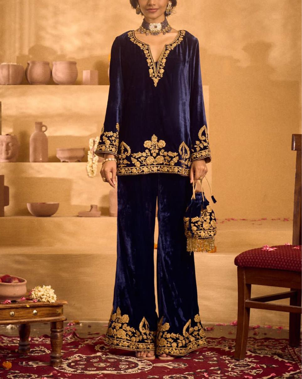 Includes: Embroidered Velvet Top, Elastic Palazzo & Matching Potli