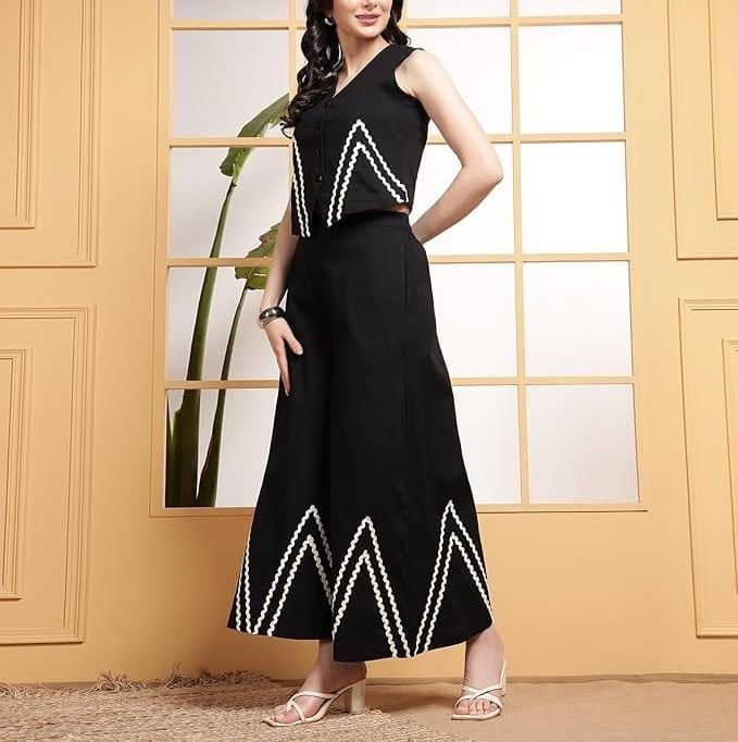 Bottom: Wide-leg palazzo pants featuring matching white zigzag lace at the hem