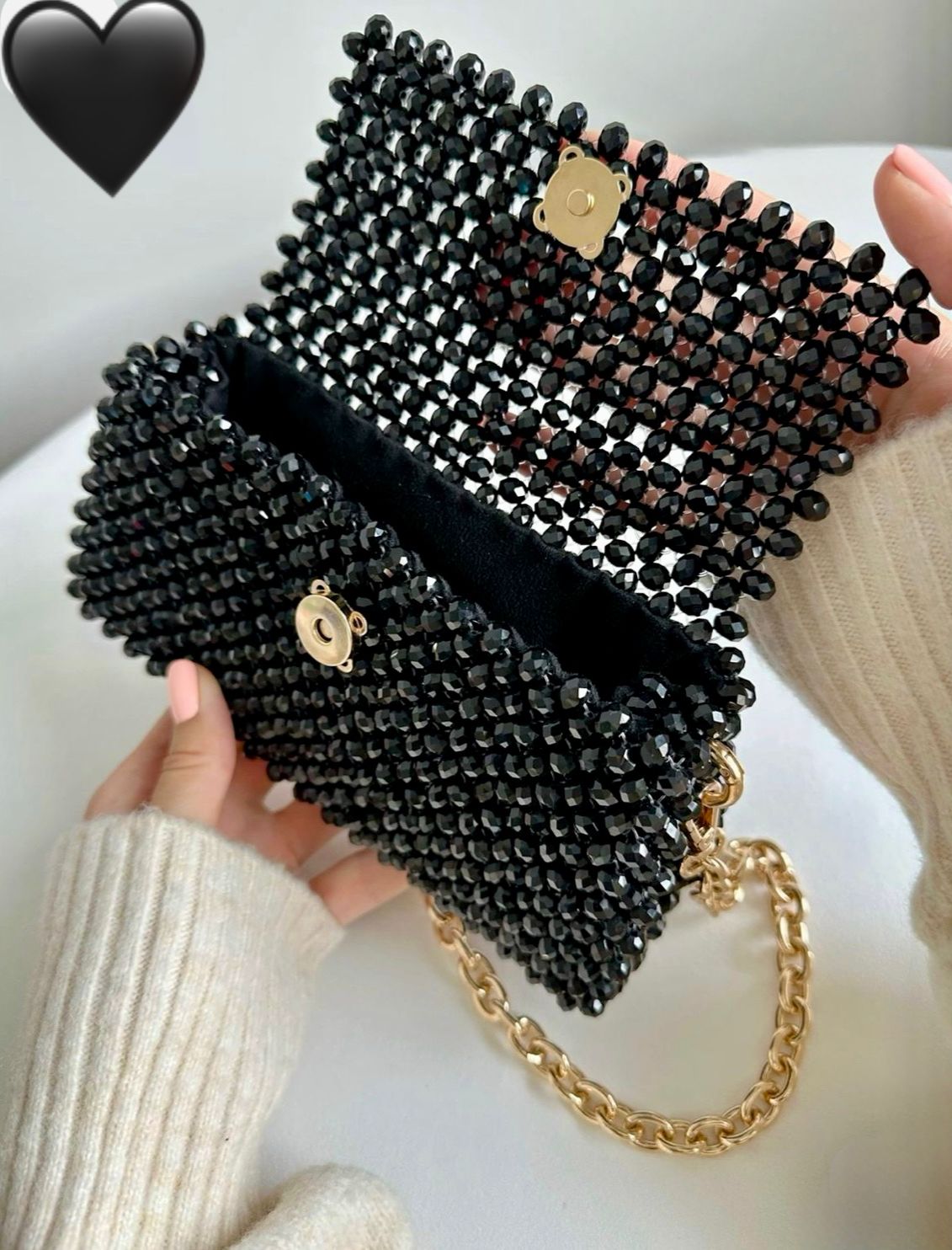 Turn heads after dark with Black Bling, a bold crystal statement bag. Handcrafted with shimmering black beads and a detachable luxe gold sling, it perfectly blends edgy glamour with timeless elegance.