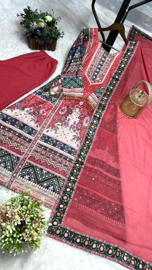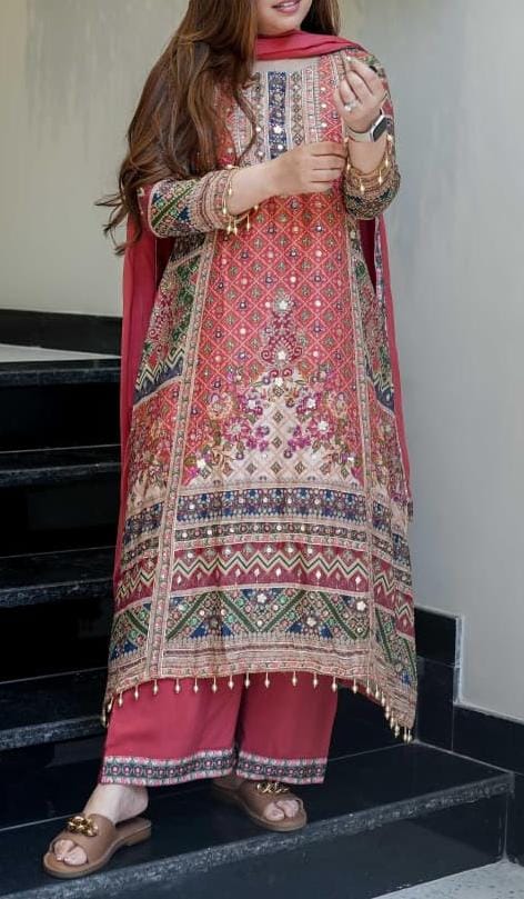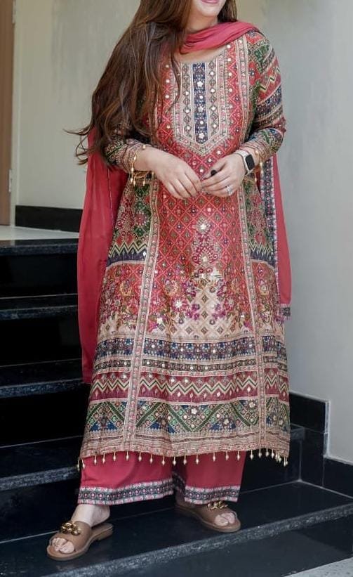 Work: Stunning digital print with ready-made lace border and real mirror handwork.