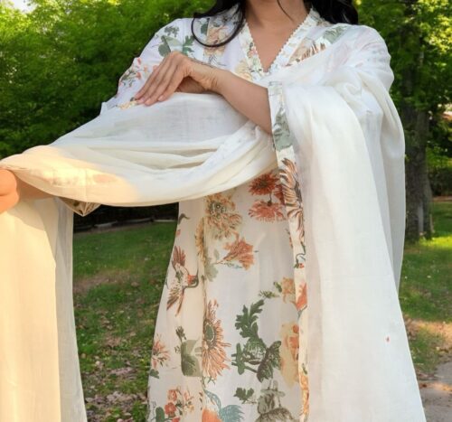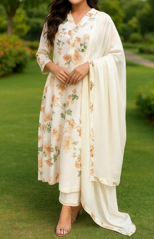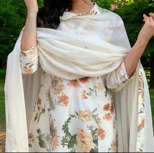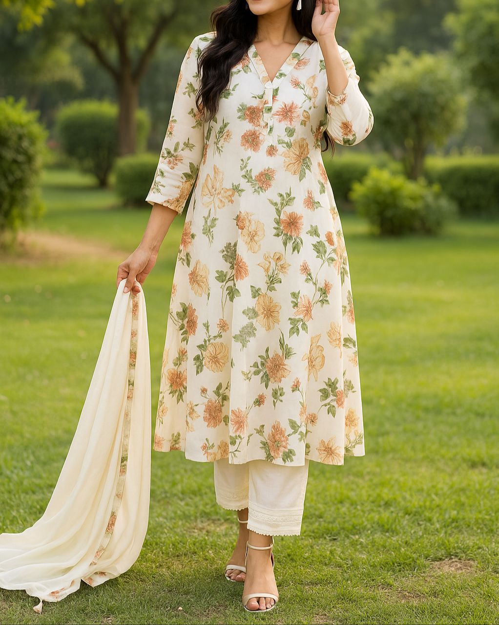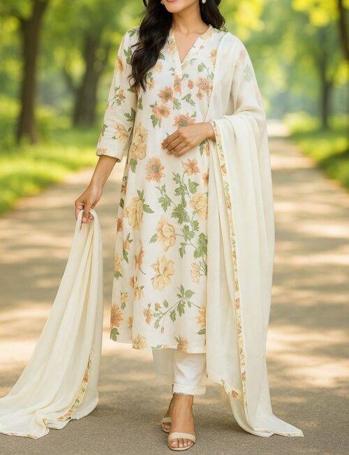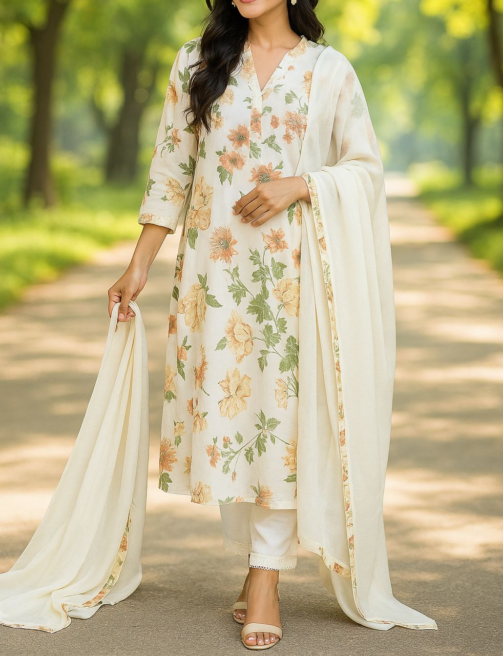 The kurta showcases a delicate floral print in soft pastel hues on a soothing ivory base, giving it a naturally fresh and feminine vibe. Paired with matching straight-cut pants and a light chiffon-like dupatta with a coordinated floral border, this suit offers a complete look thatβs equal parts sophisticated and effortless.