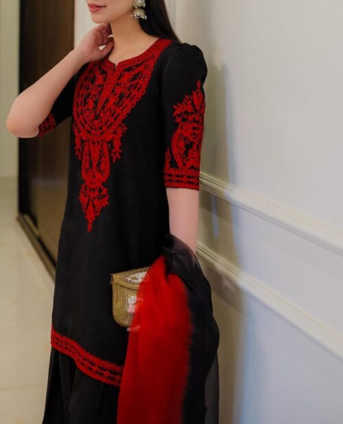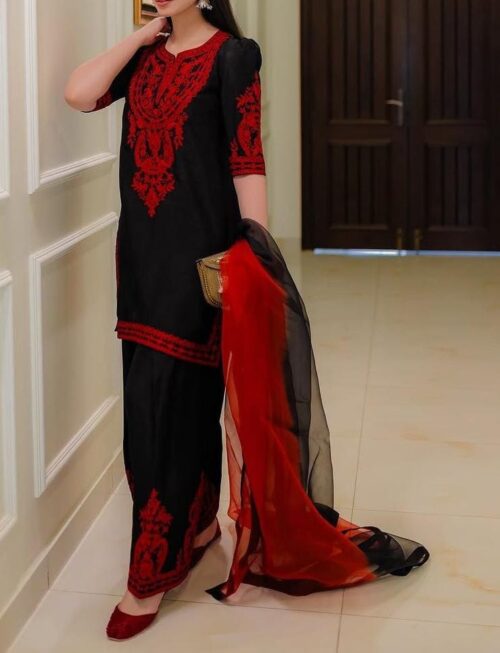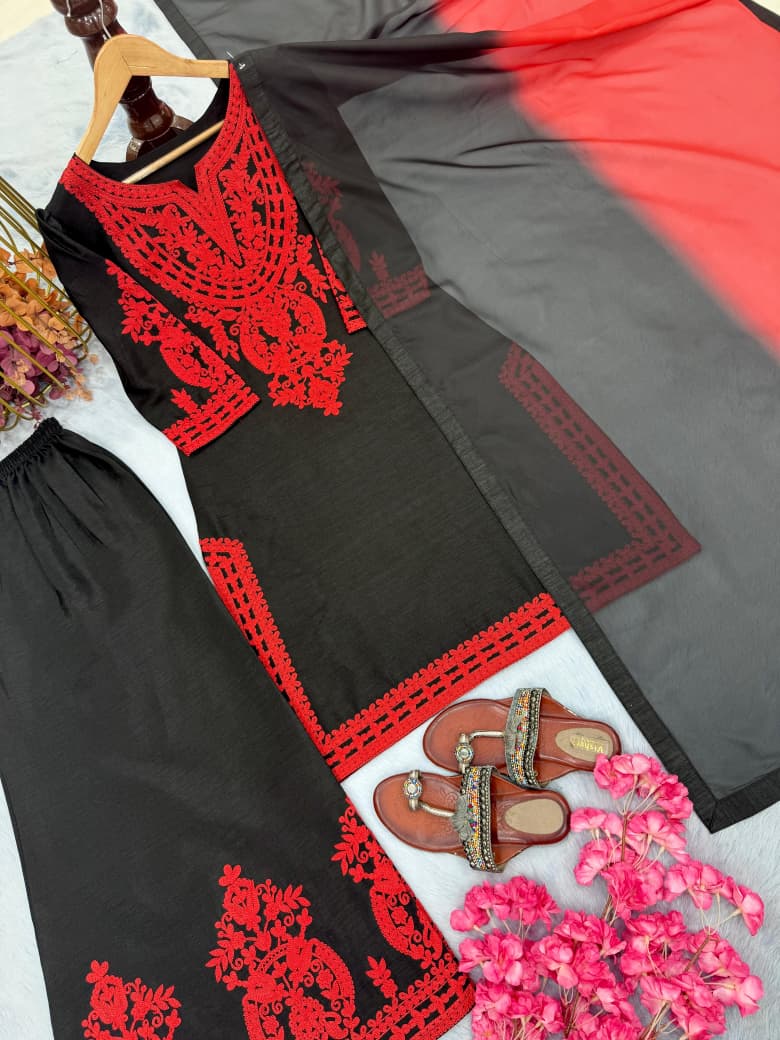 Crafted in luxurious Chinon Silk, this set blends timeless elegance with modern style. The fabric’s soft, flowing texture and subtle sheen make it perfect for all special occasions. Delicate embroidery and fine finishing add a touch of sophistication, while the lightweight drape ensures comfort all day long.