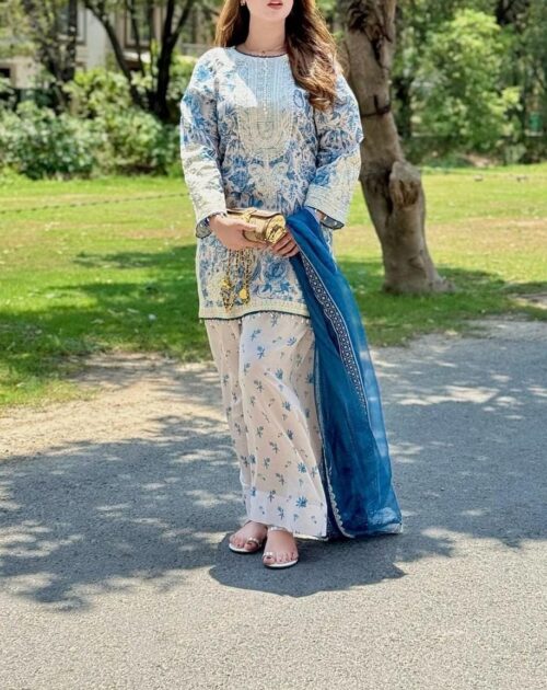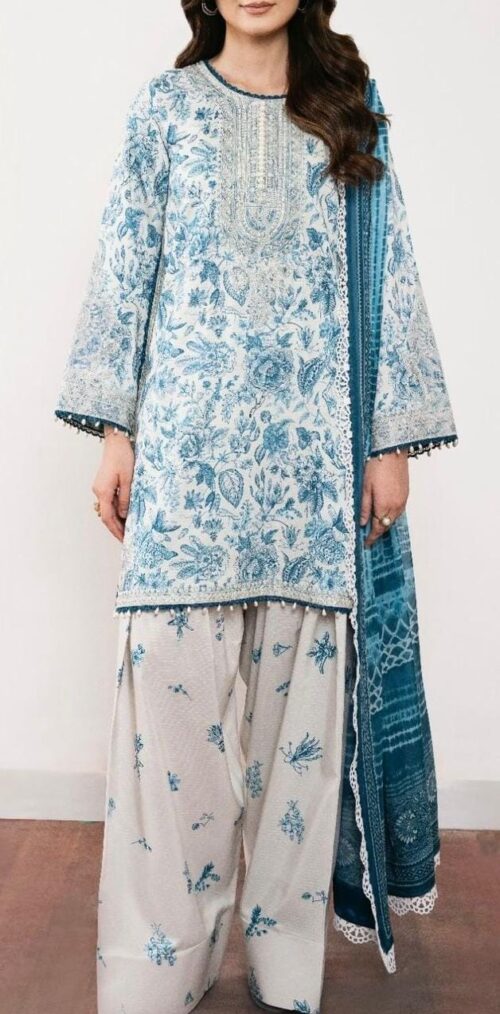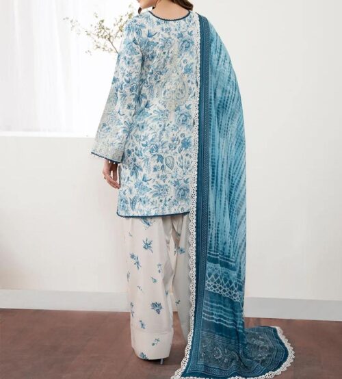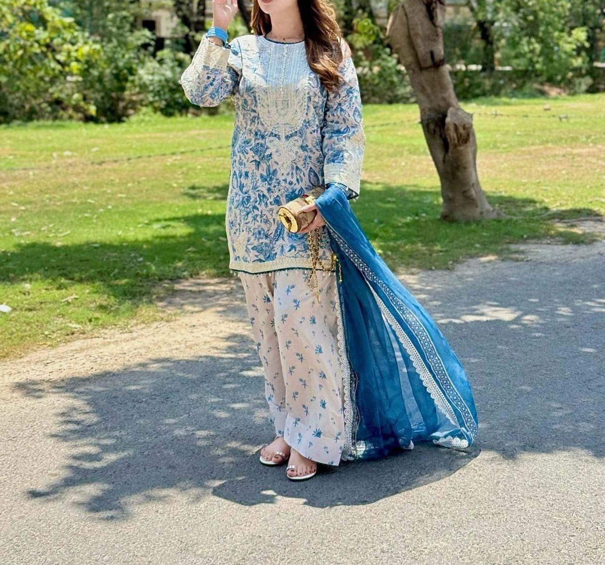 Dupatta: Lightweight Faux Georgette with Digital Print, finished with a Four-Side Fancy Lace Border. Length: 2.20 meters.