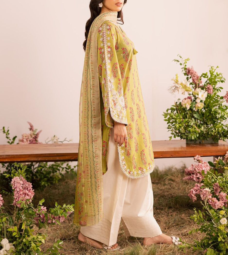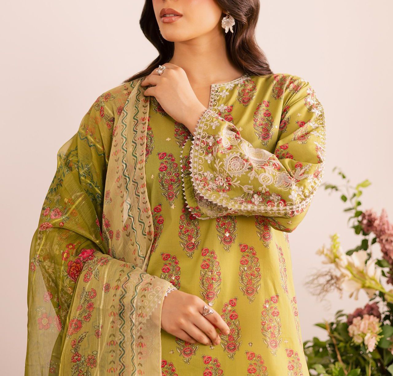 Kurta (Top): Heavy French Crepe with Embroidery & Digital Print | Inner: Micro Cotton | Length: 38”