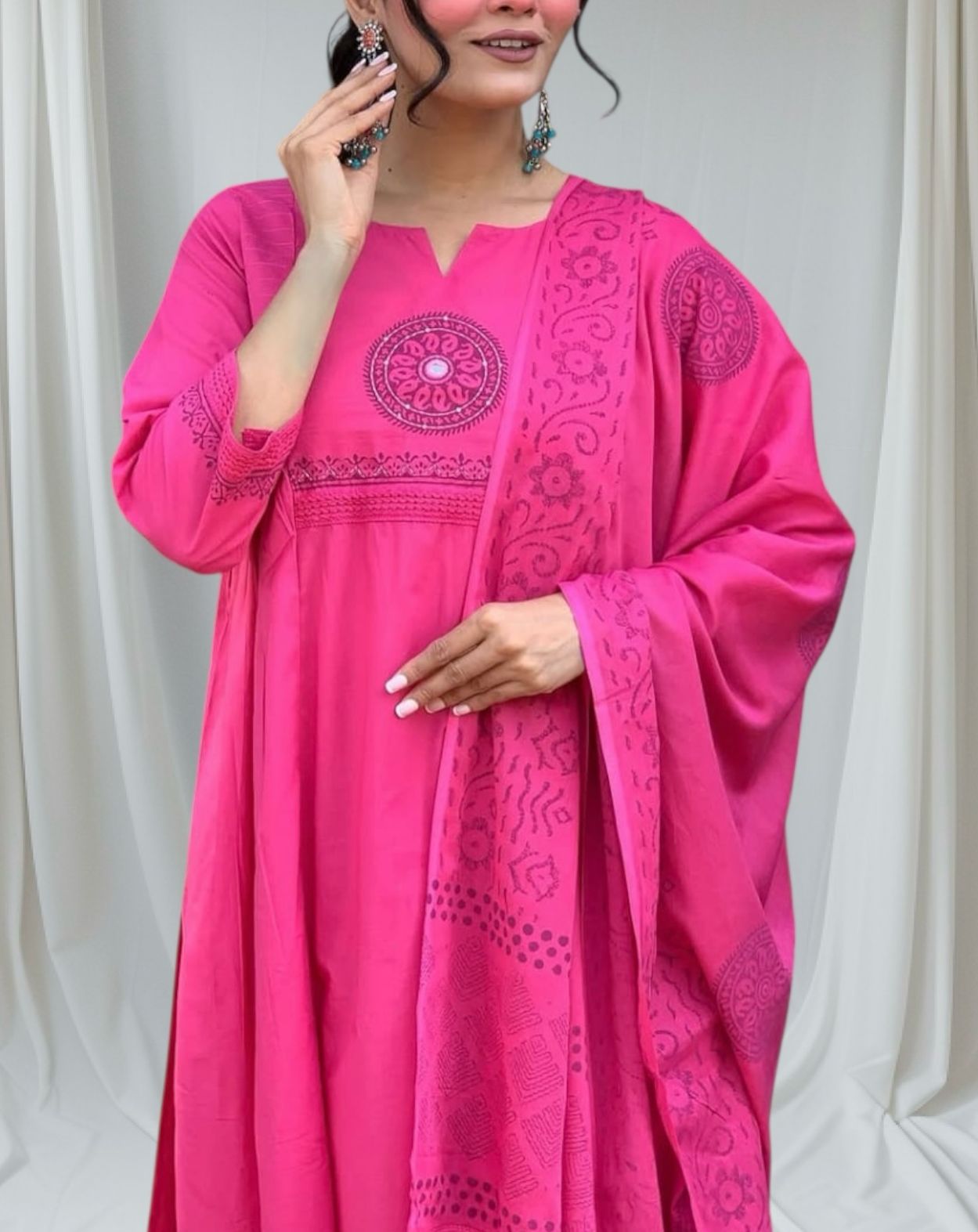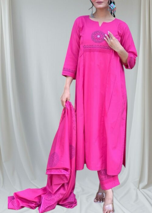 Elegant pink cotton suit set featuring fine embroidery on the kurta, matching straight pants, and a beautifully detailed dupatta. Soft, breathable, and perfect for festive or casual occasions.