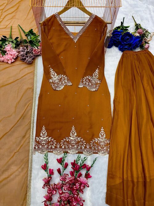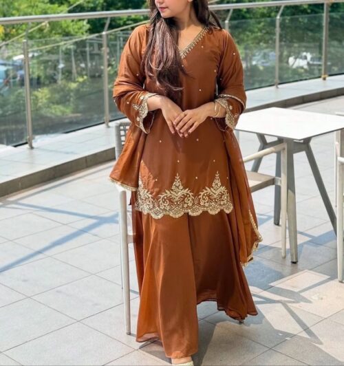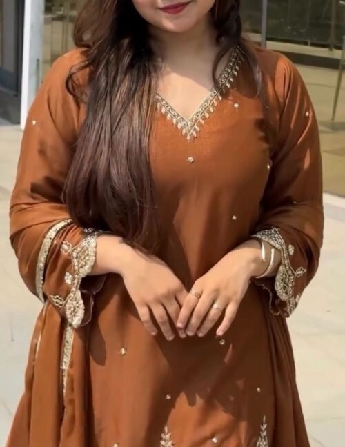Step into elegance with this stunning faux georgette suit, designed for comfort and style. Featuring a flowy silhouette with delicate embroidery on the neckline, this suit exudes traditional charm with a modern twist. Perfect for festive occasions or casual gatherings..