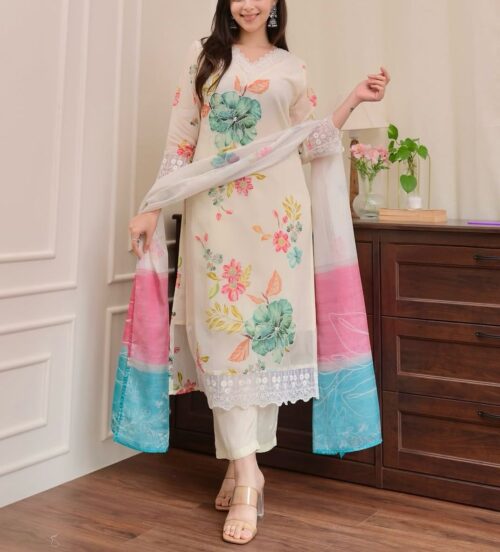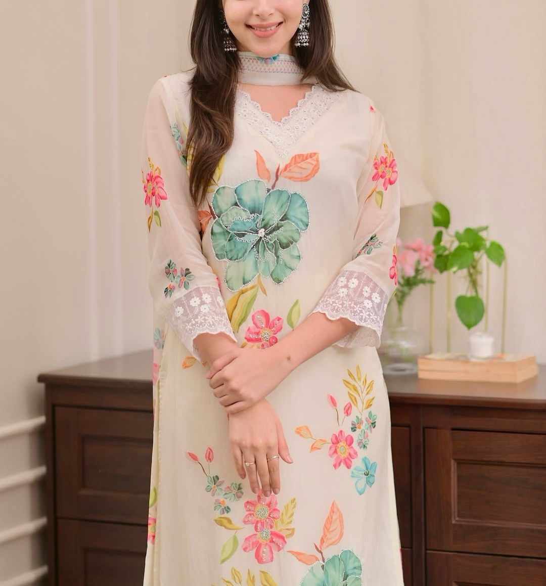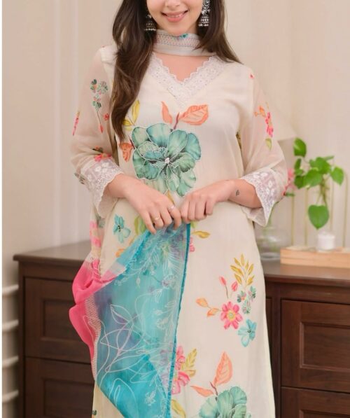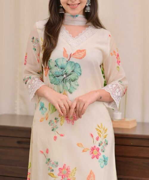 Elevate your everyday ethnic wardrobe with our Reshmi Organza Dupatta Pant Set, designed for style, comfort, and elegance. This three-piece ensemble features a finely tailored kurta adorned with full handwork and an intricately crafted neckline, paired with matching pants and a soft, airy organza dupatta.