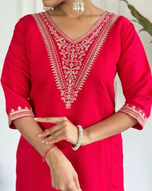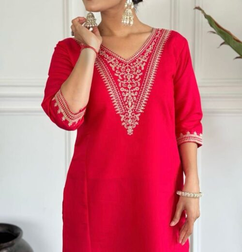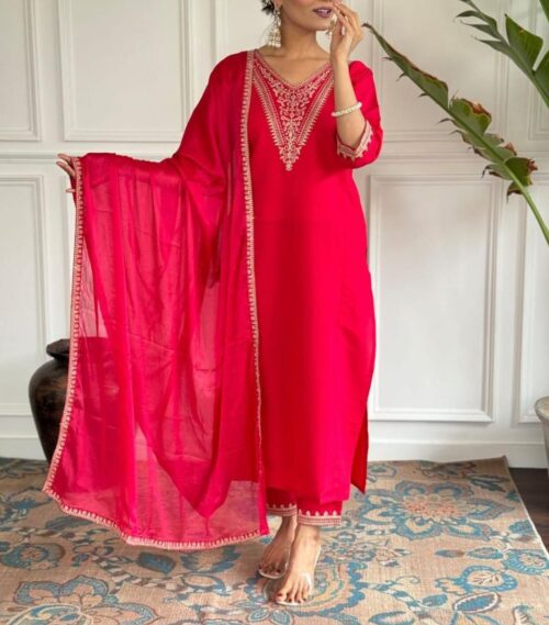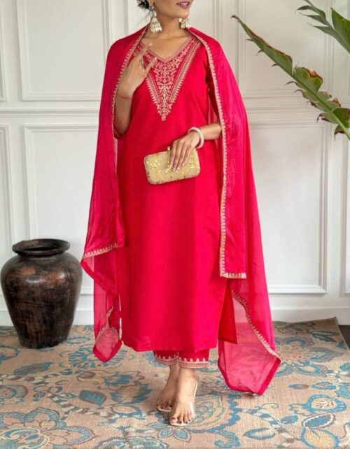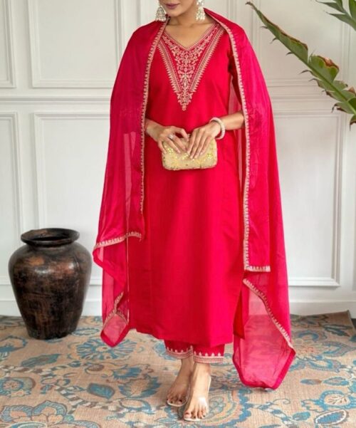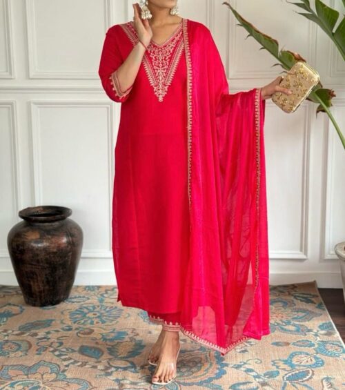 Elevate your ethnic wardrobe with the Scarlet Grace Roman Silk Suit, a perfect harmony of elegance and comfort. Made from luxurious Roman silk, this vibrant red suit features intricate thread embroidery around the neckline and hem, adding a touch of traditional charm.