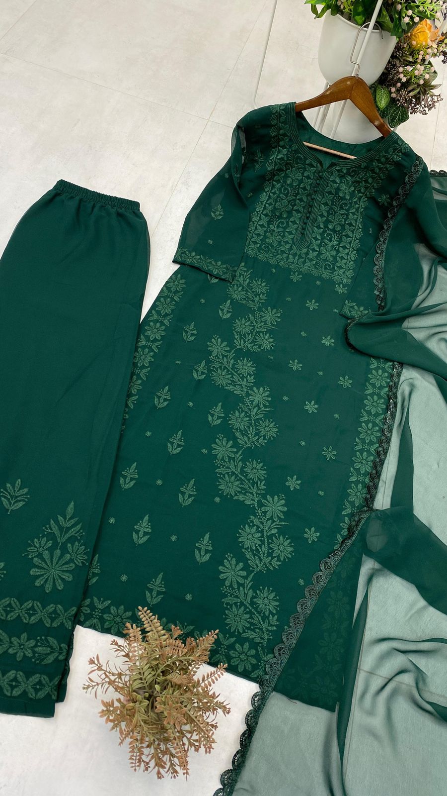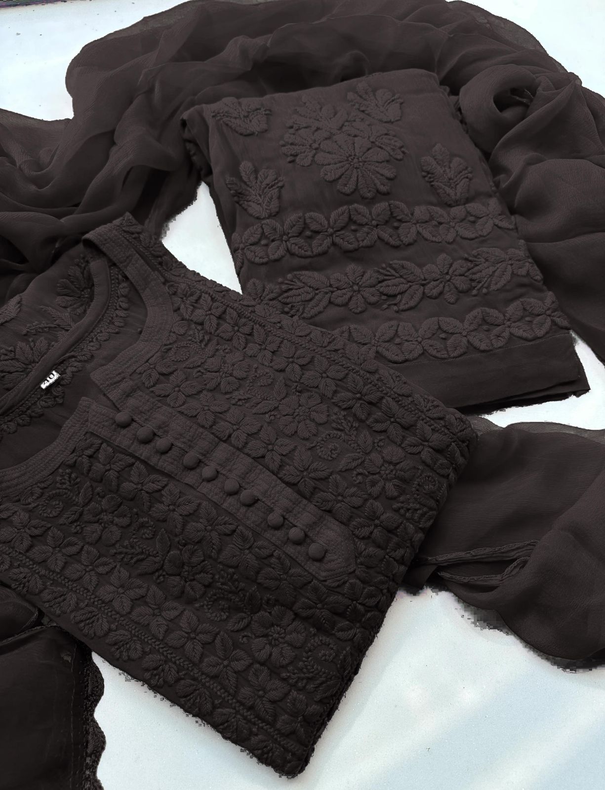 Top: Premium faux georgette with intricate embroidery, soft micro lining for comfort.