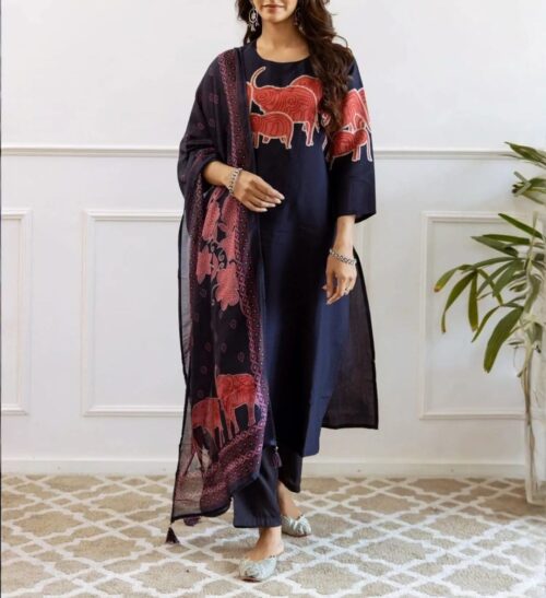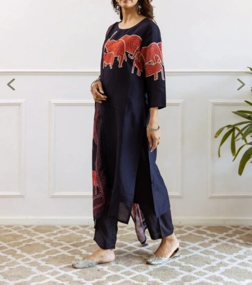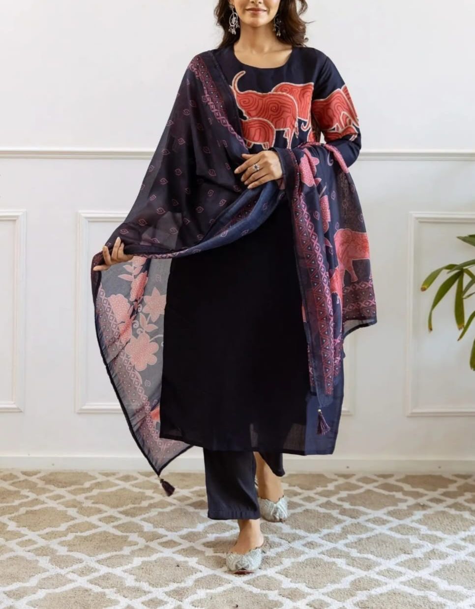 The midnight blue kurta is paired with matching pants and a beautifully coordinated dupatta, bringing a perfect blend of tradition and contemporary design.
