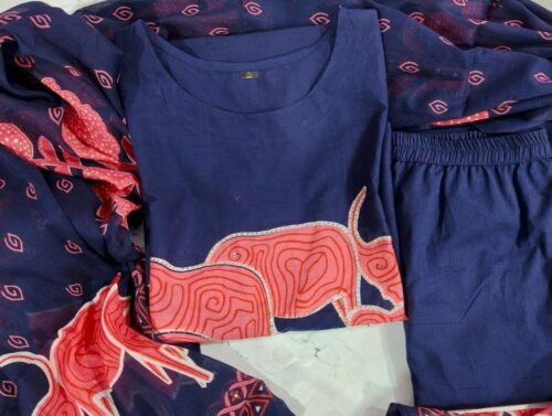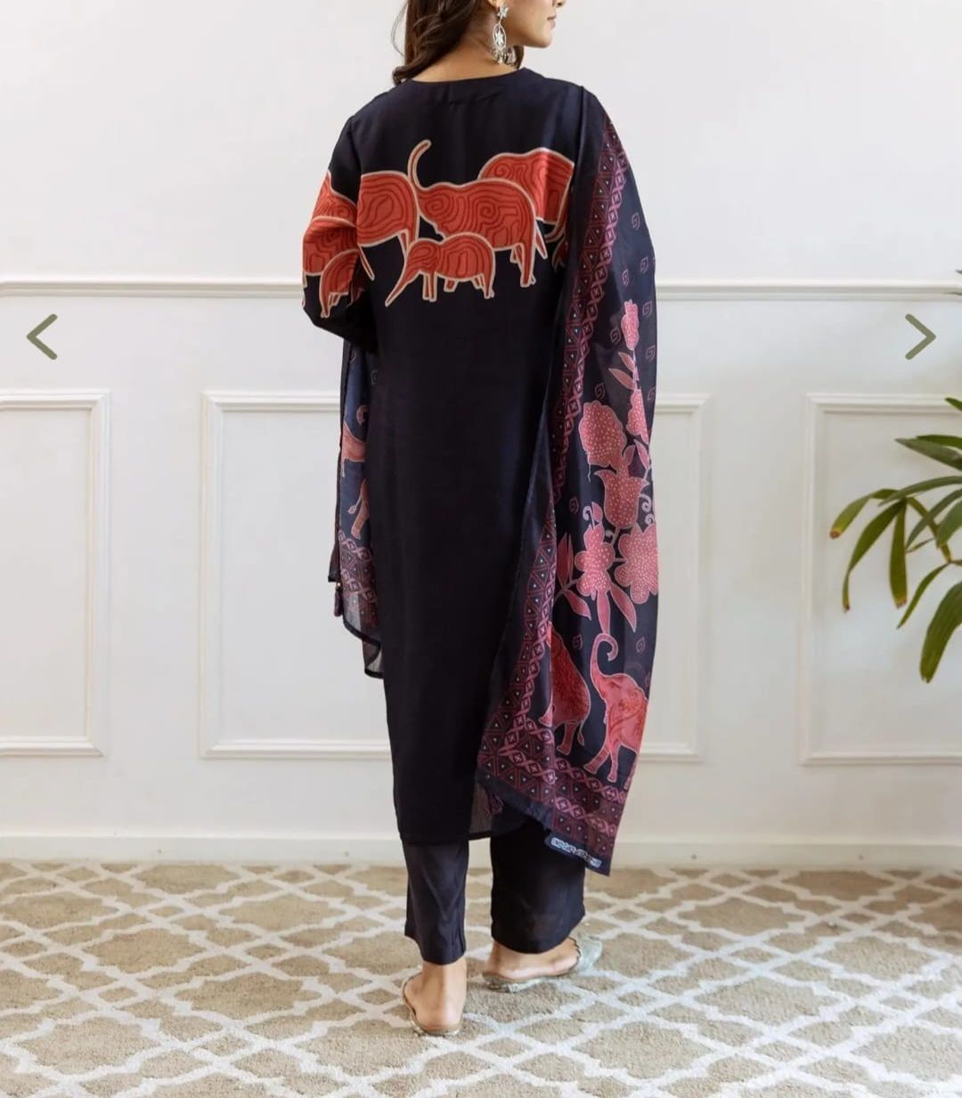Make a bold yet earthy statement with this stunning cotton suit set featuring hand-printed tribal animal motifs in a rich terracotta hue.