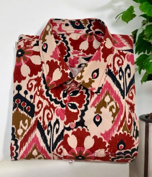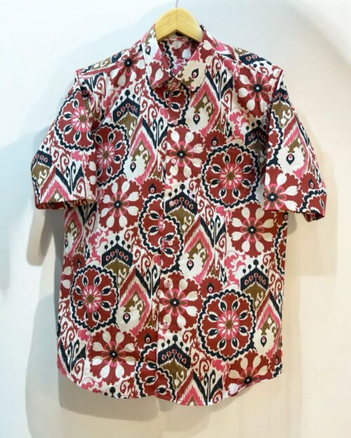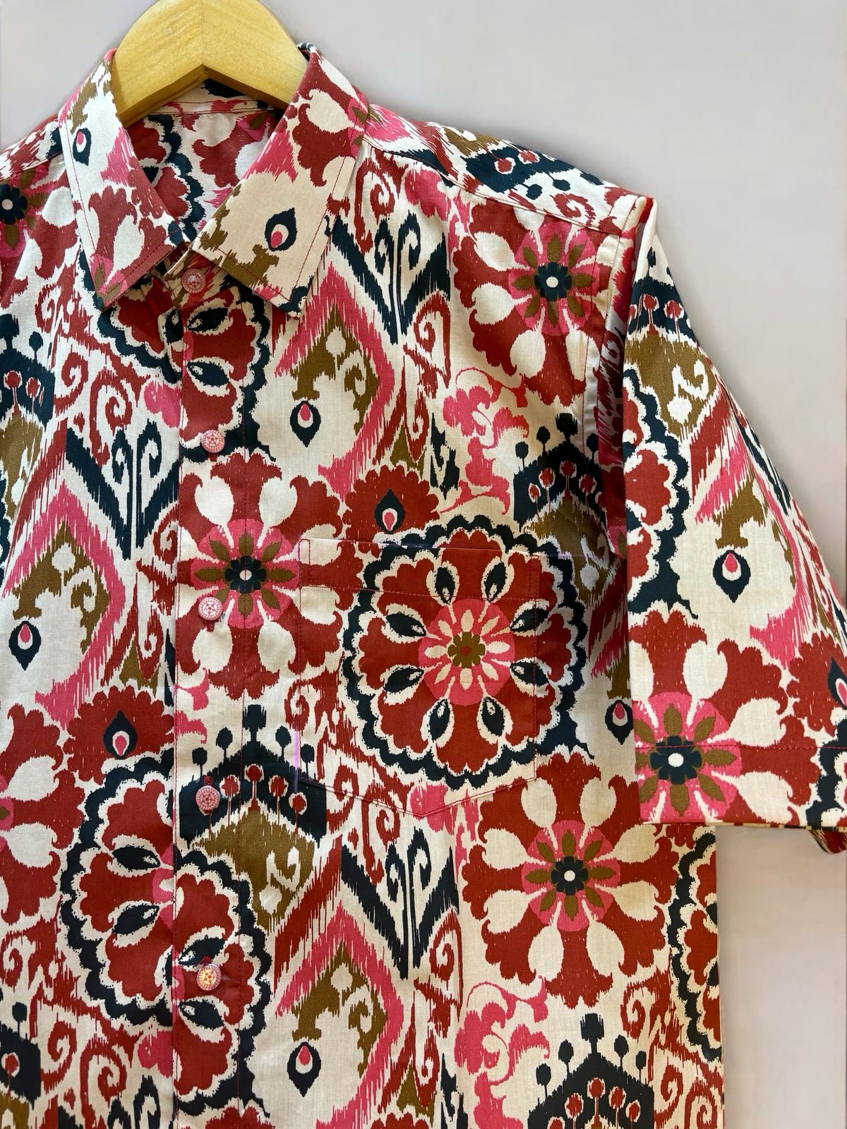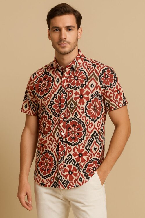 This menβs shirt features an eye-catching floral and geometric pattern in rich earthy tonesβperfect for festive occasions or laid-back evenings. Designed with a classic collar and short sleeves, it offers a relaxed yet polished look.