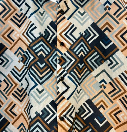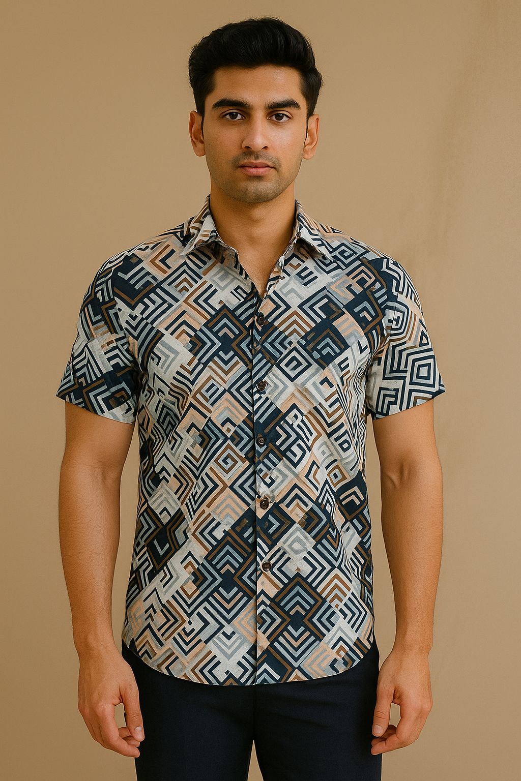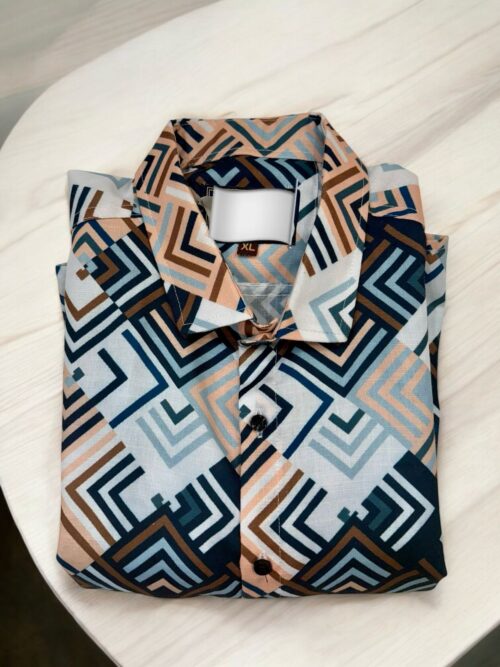 Step into style with our Urban Maze Cotton Shirt, featuring a striking geometric pattern in earthy tones of beige, navy, and rust. Made from premium breathable cotton, this shirt offers all-day comfort with a sharp, modern look. Ideal for casual outings, vacation vibes, or relaxed office wear β€” it’s a versatile addition to any wardrobe.