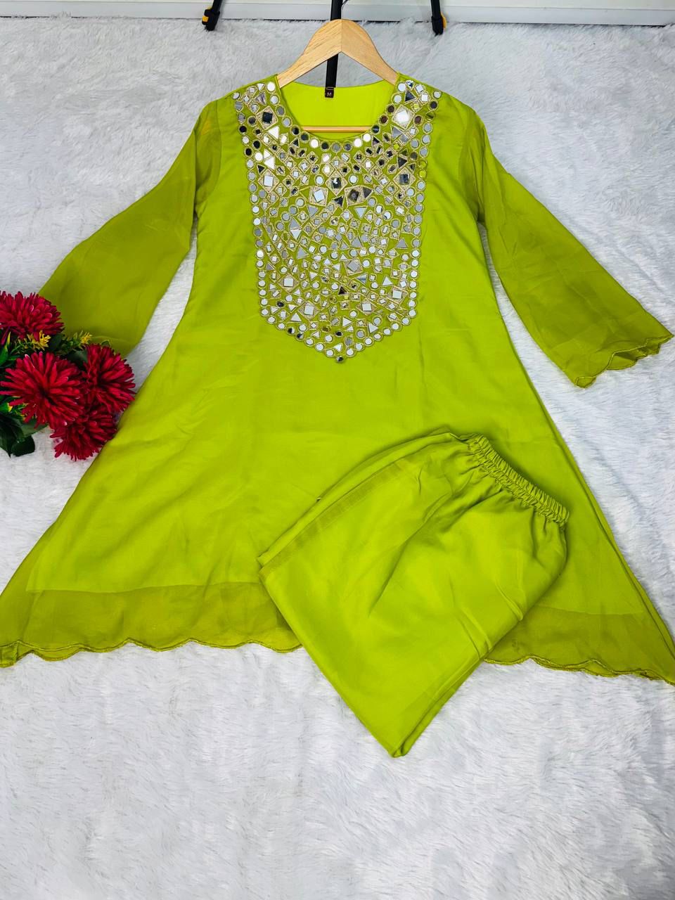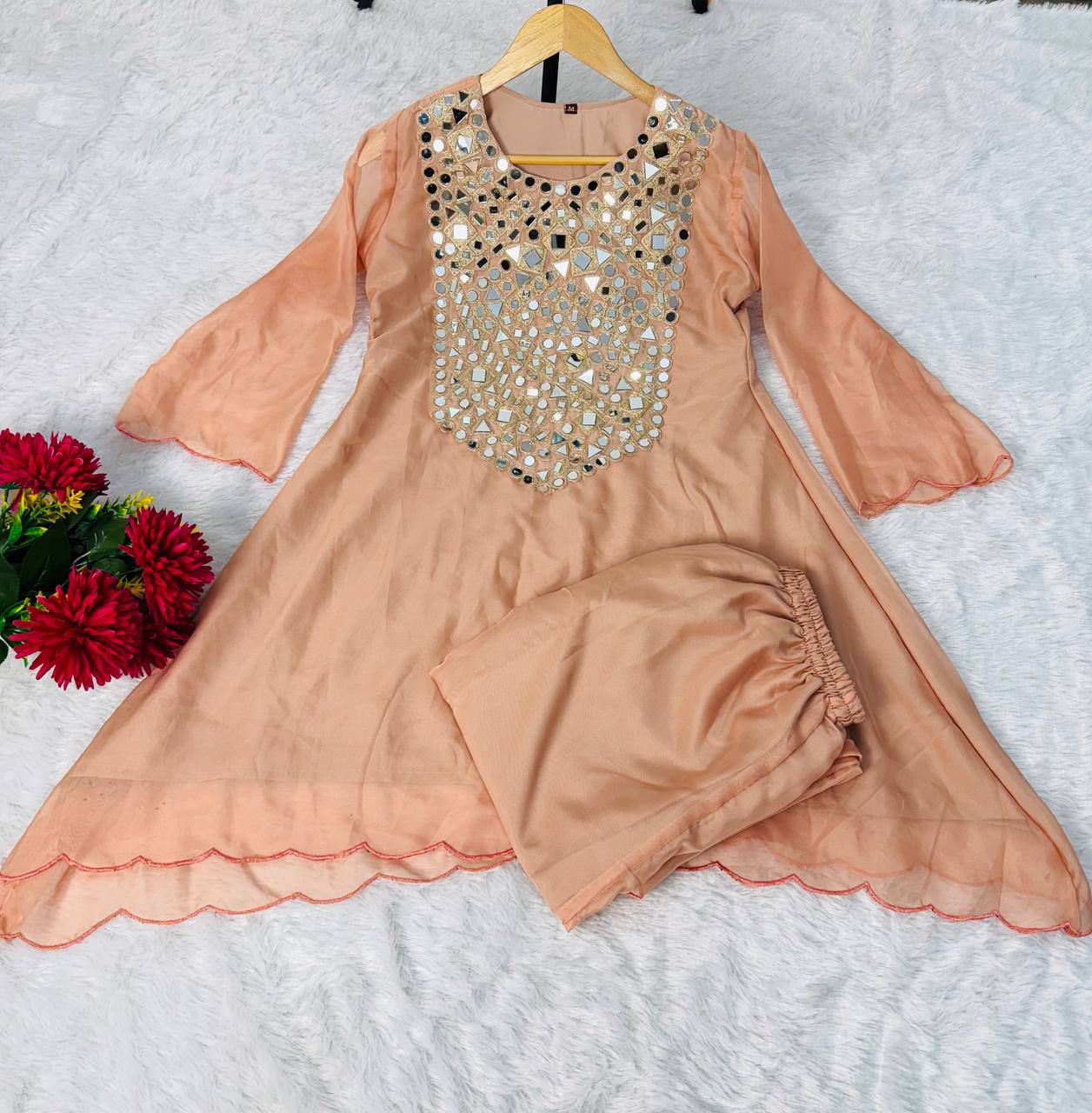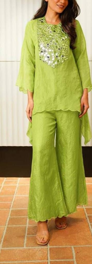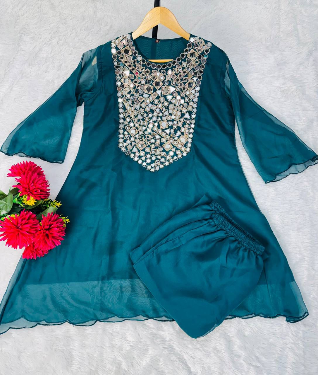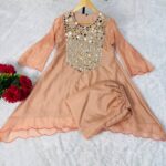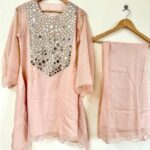Designed with elegant semi-bell sleeves, stylish coded embroidery, and original mirror work with fine detailing on the edges.