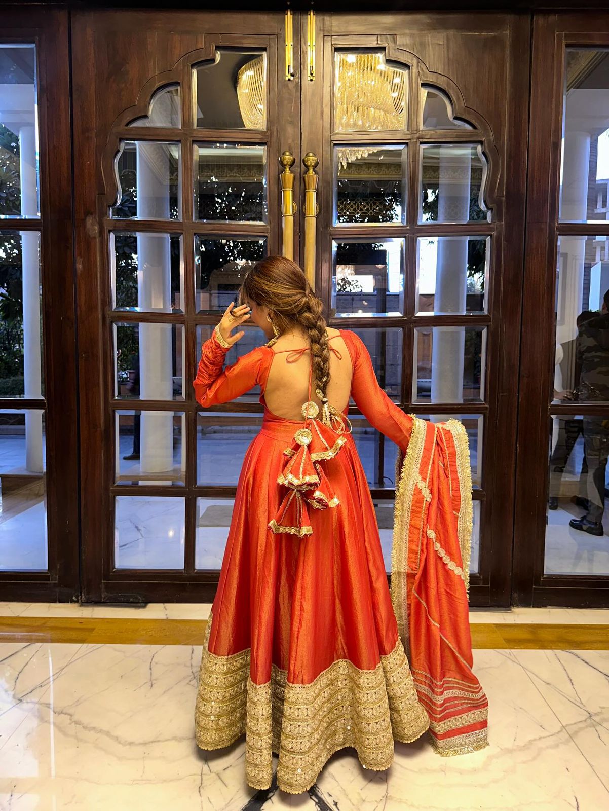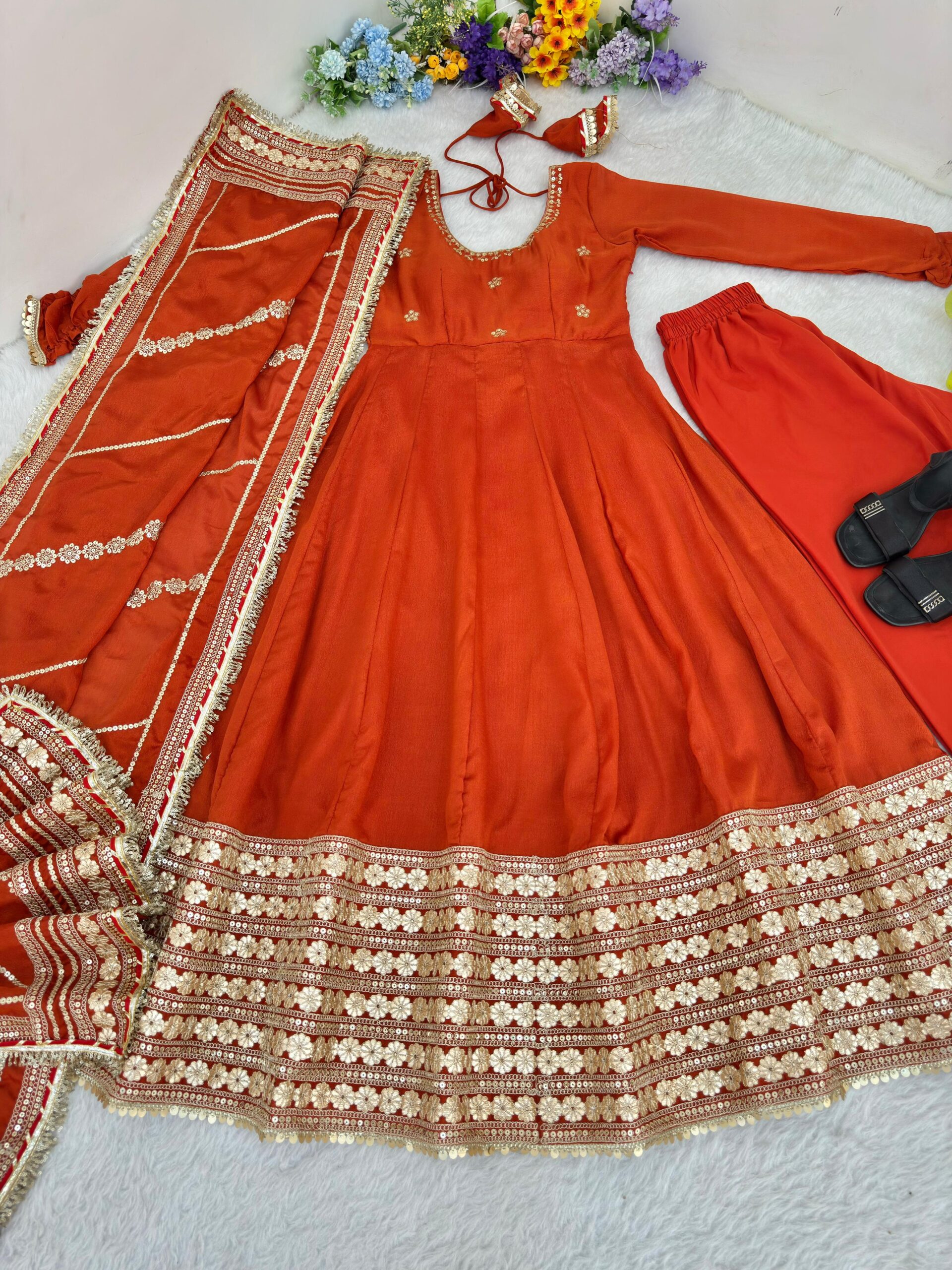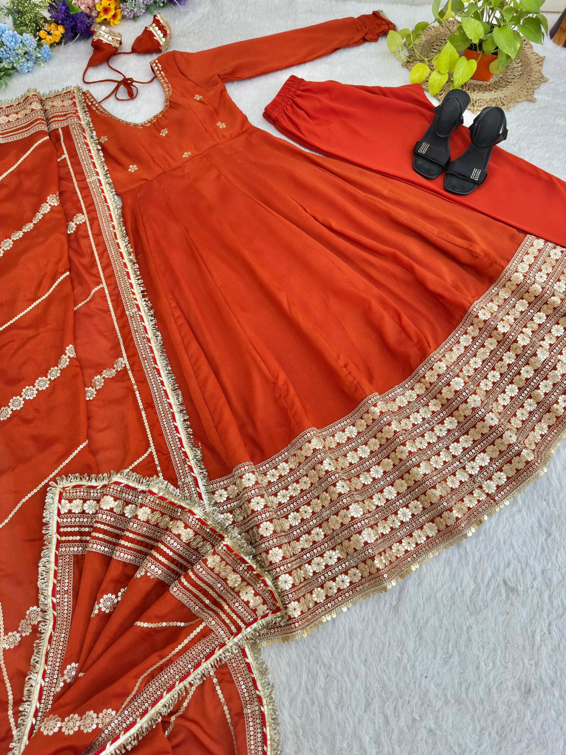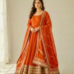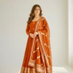 Draped in a rich rust hue, this dreamy Anarkali is all about grace, glow, and glamour.