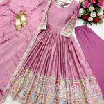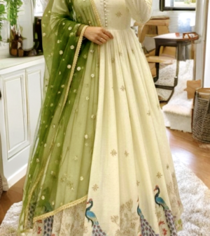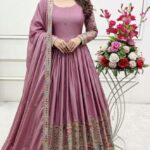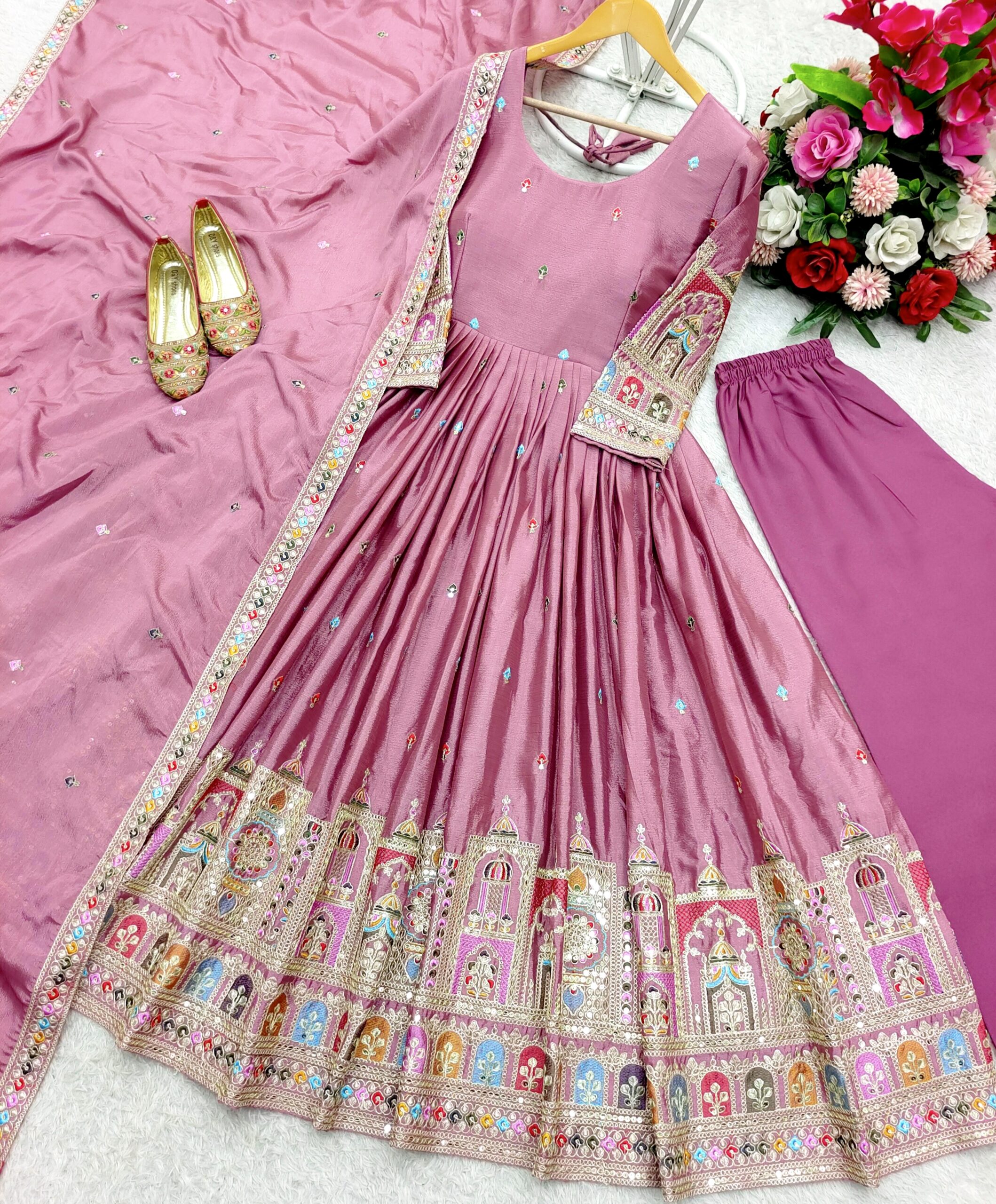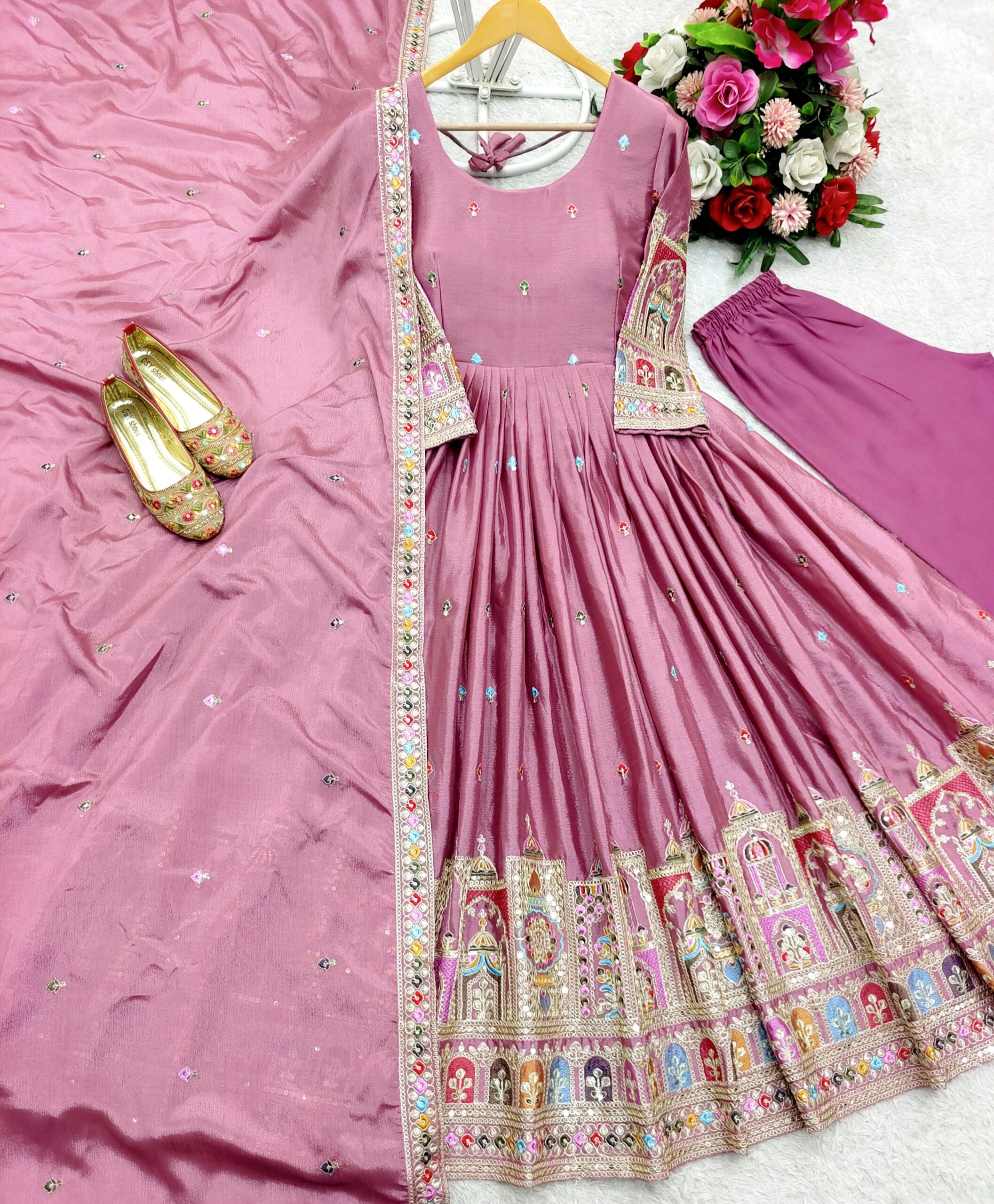 Dupatta: Pure Chinon Silk adorned with elegant embroidery and sequence work.
