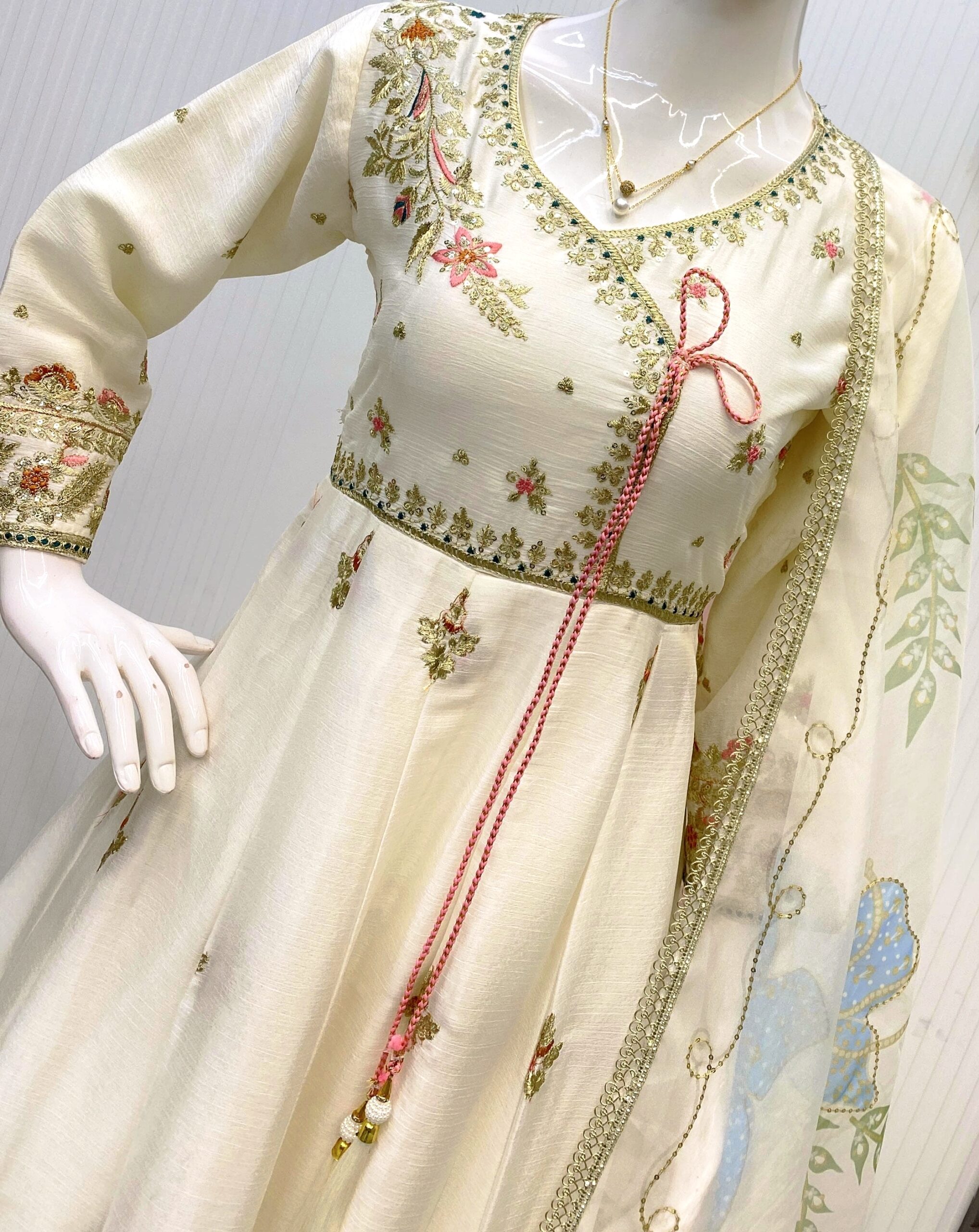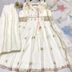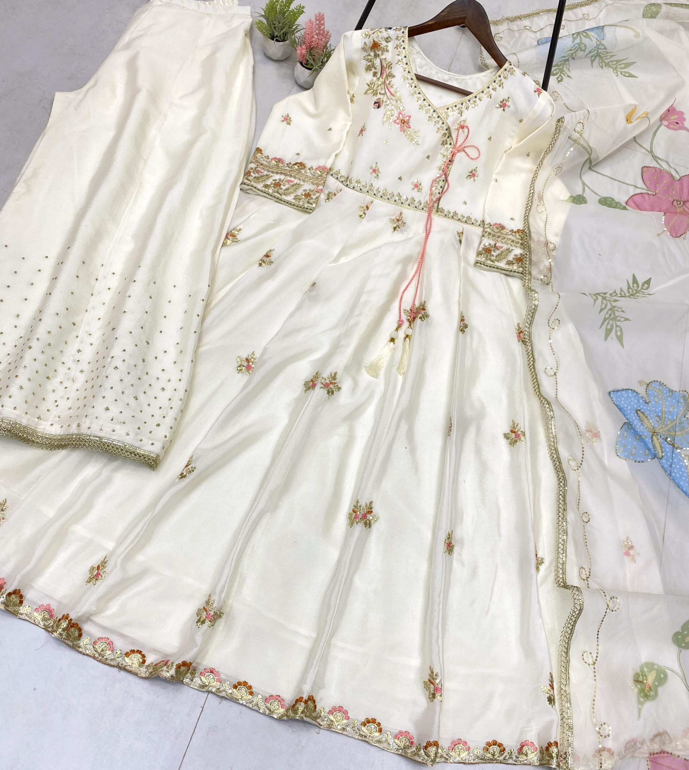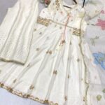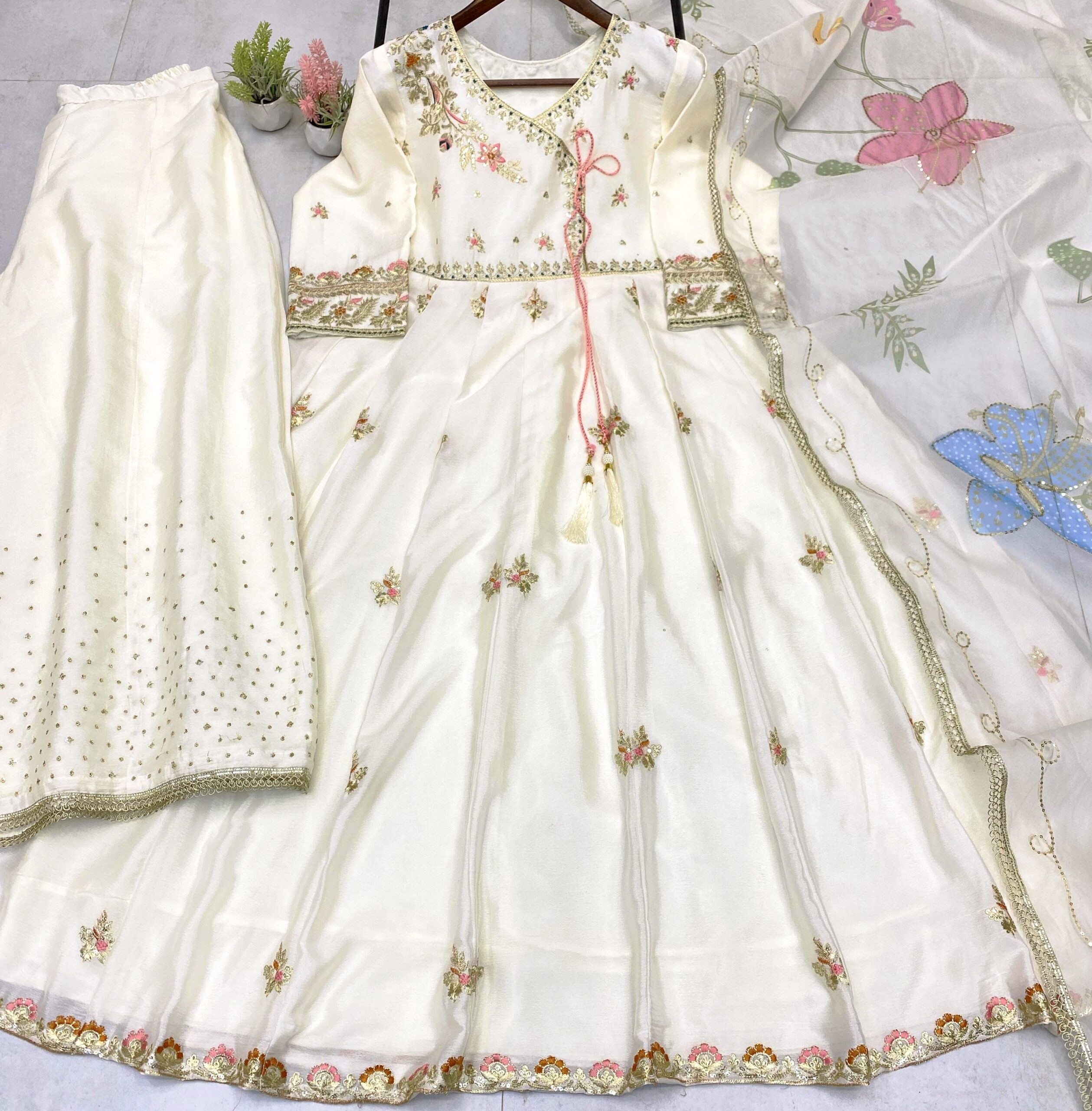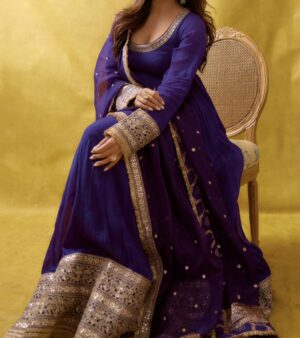 Premium Chinon Gown adorned with rich sequence embroidery, elegant dori tassels & flawless finish โ paired with embroidered Chinon Palazzo and a printed Organza dupatta with exquisite lace border.