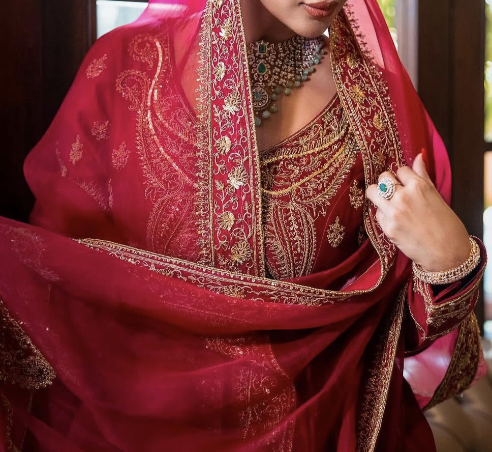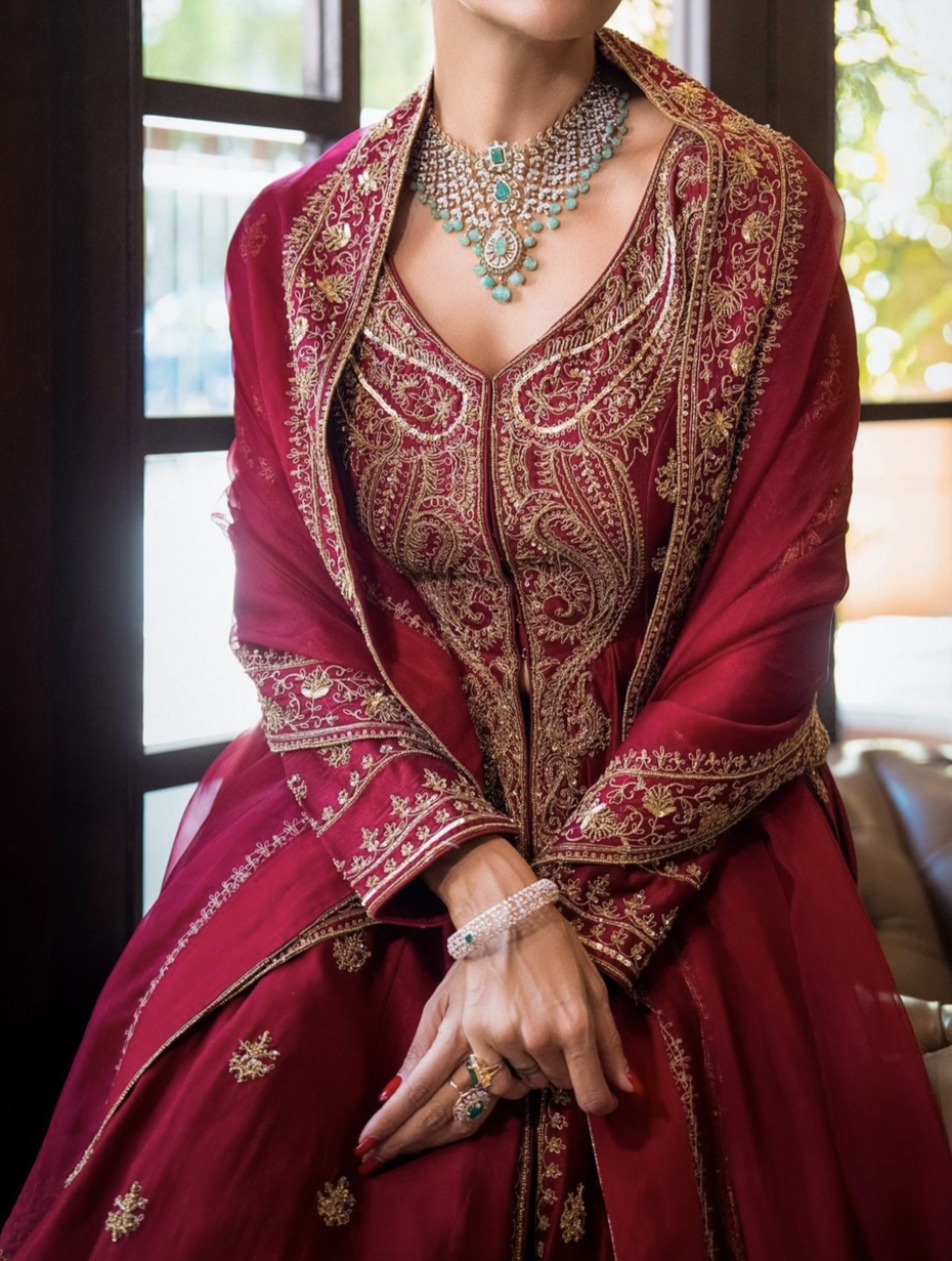 Work: Exquisite zari, thread, and 5mm sequins embroidery.