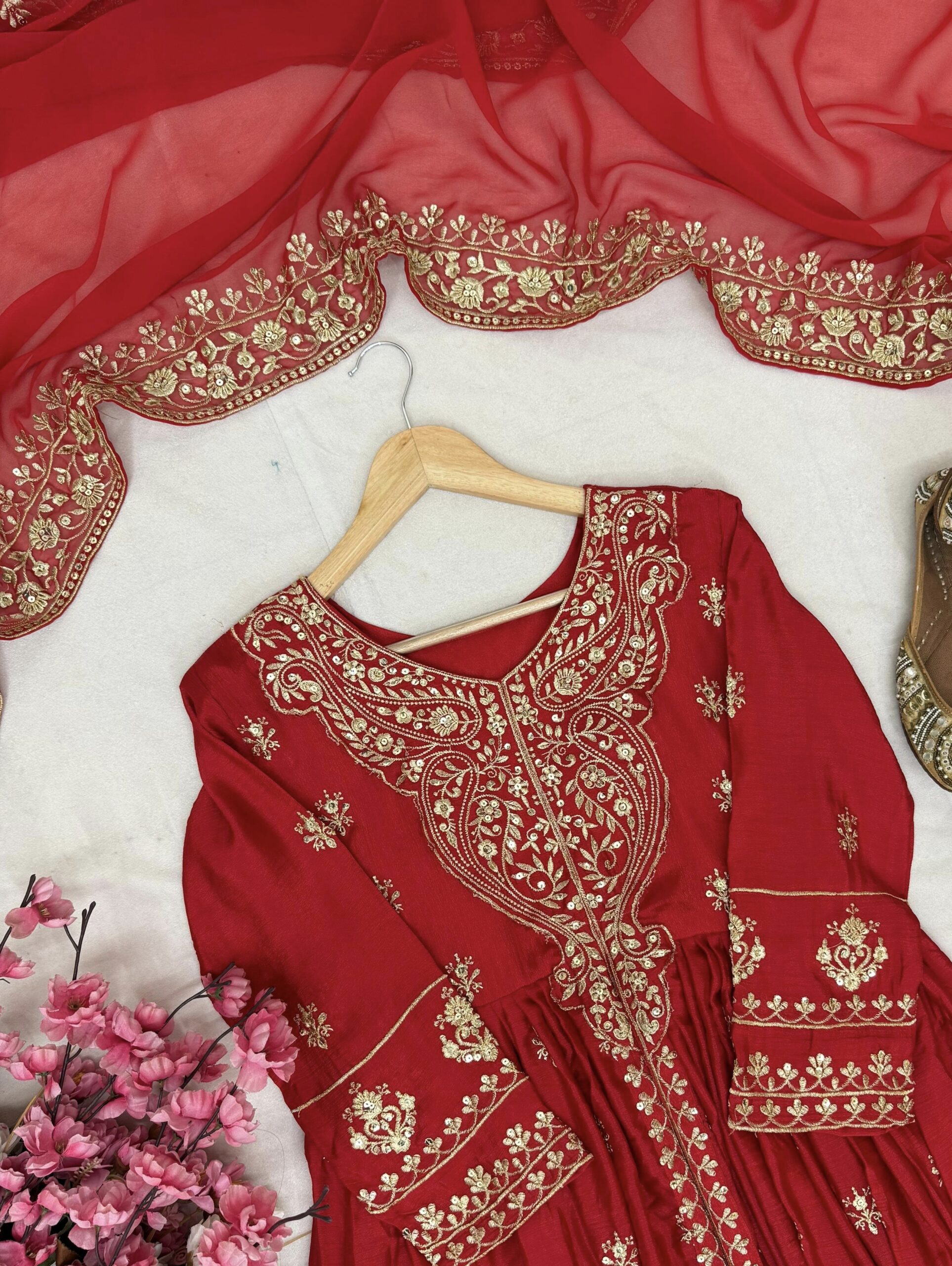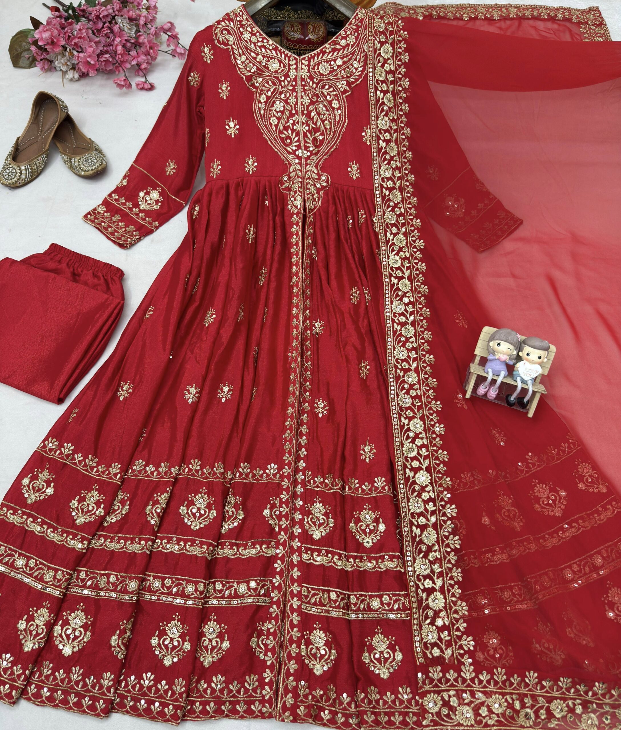 Enhance the beauty of your wardrobe with this newly launched Designer Anarkali Gown set, crafted to bring grace and grandeur to every occasion. Made from luxurious Chinon Silk and paired with an elegant embroidered dupatta, this ensemble is the perfect blend of comfort, style, and craftsmanship.