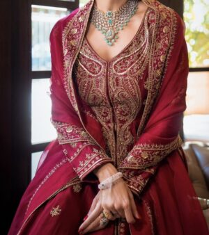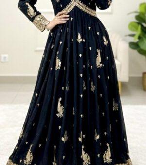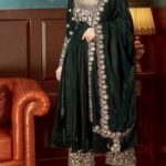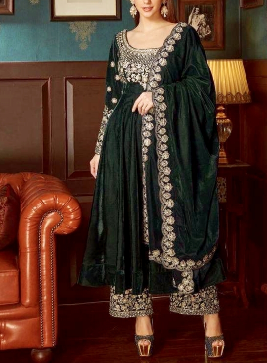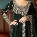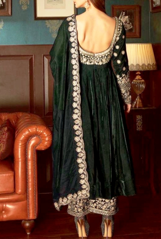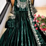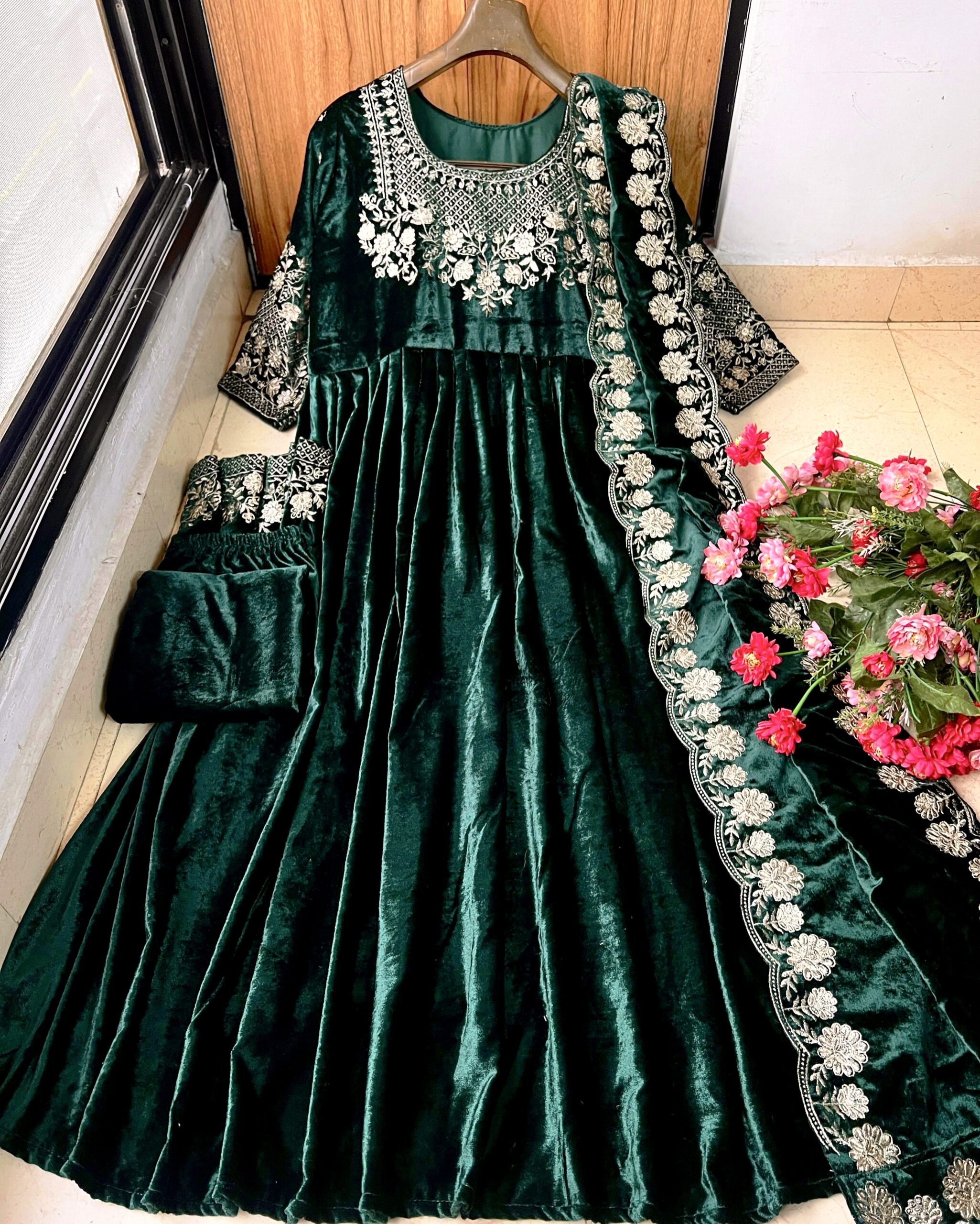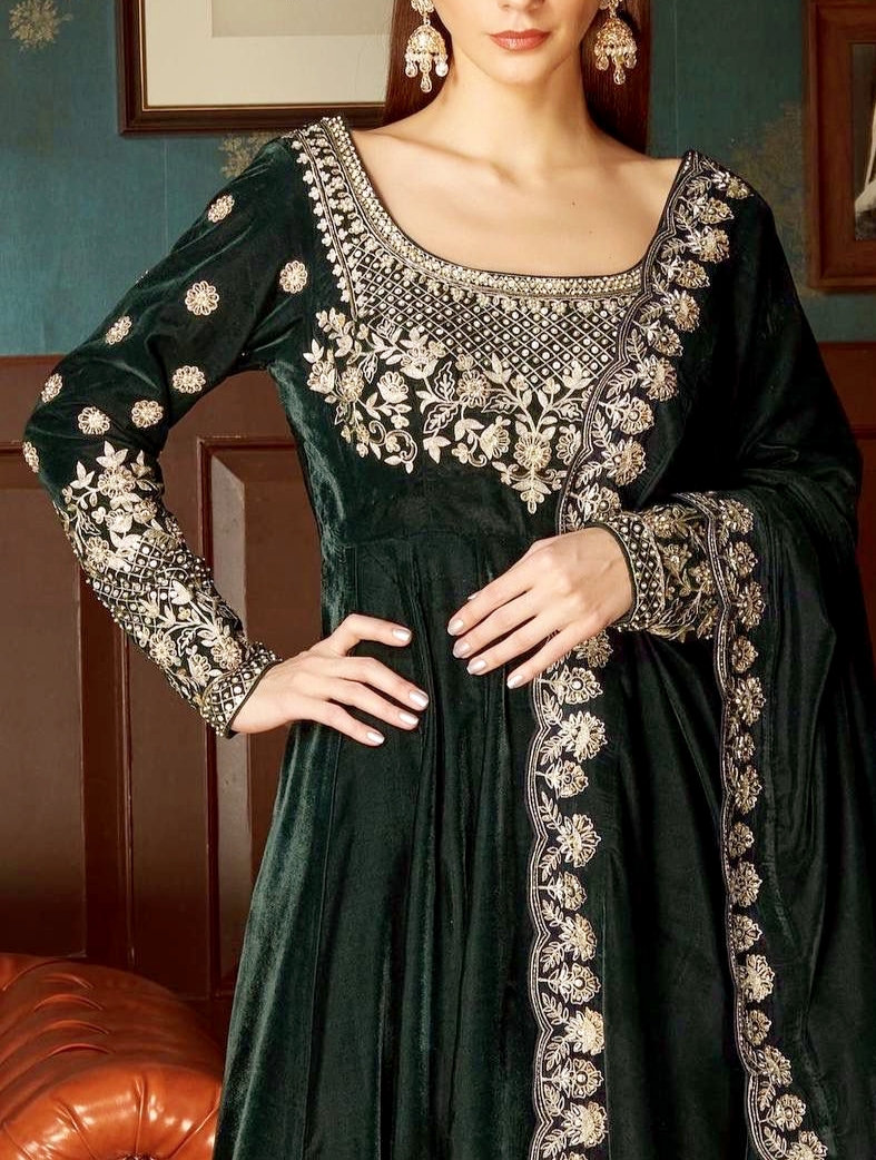Crafted in luxurious heavy velvet, this stunning Anarkali set features intricate embroidery work that reflects fine craftsmanship. Designed to make you look elegant, graceful, and effortlessly stunning, this outfit is perfect for festive and special occasions.