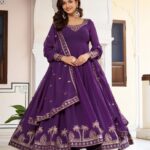 A perfect blend of elegance and modern style, this trendy gown set is designed to make you stand out at every occasion. Comes with a matching pant and dupatta for a complete ethnic look.