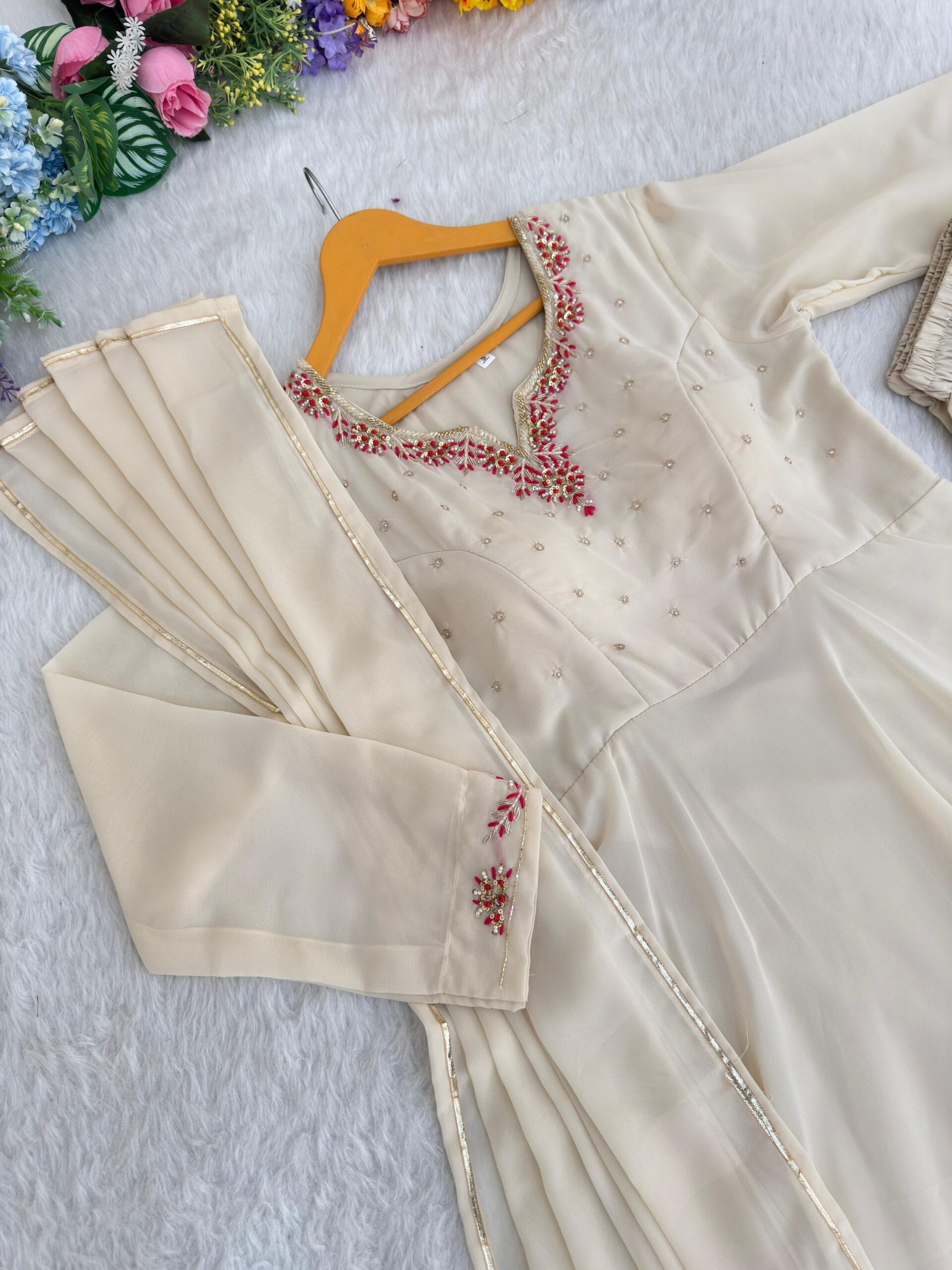 Crafted in luxurious georgette with exquisite handwork detailing, this dreamy gown set is all about elegance with a touch of royalty. Flowing 4-meter flair for that perfect twirl.
