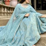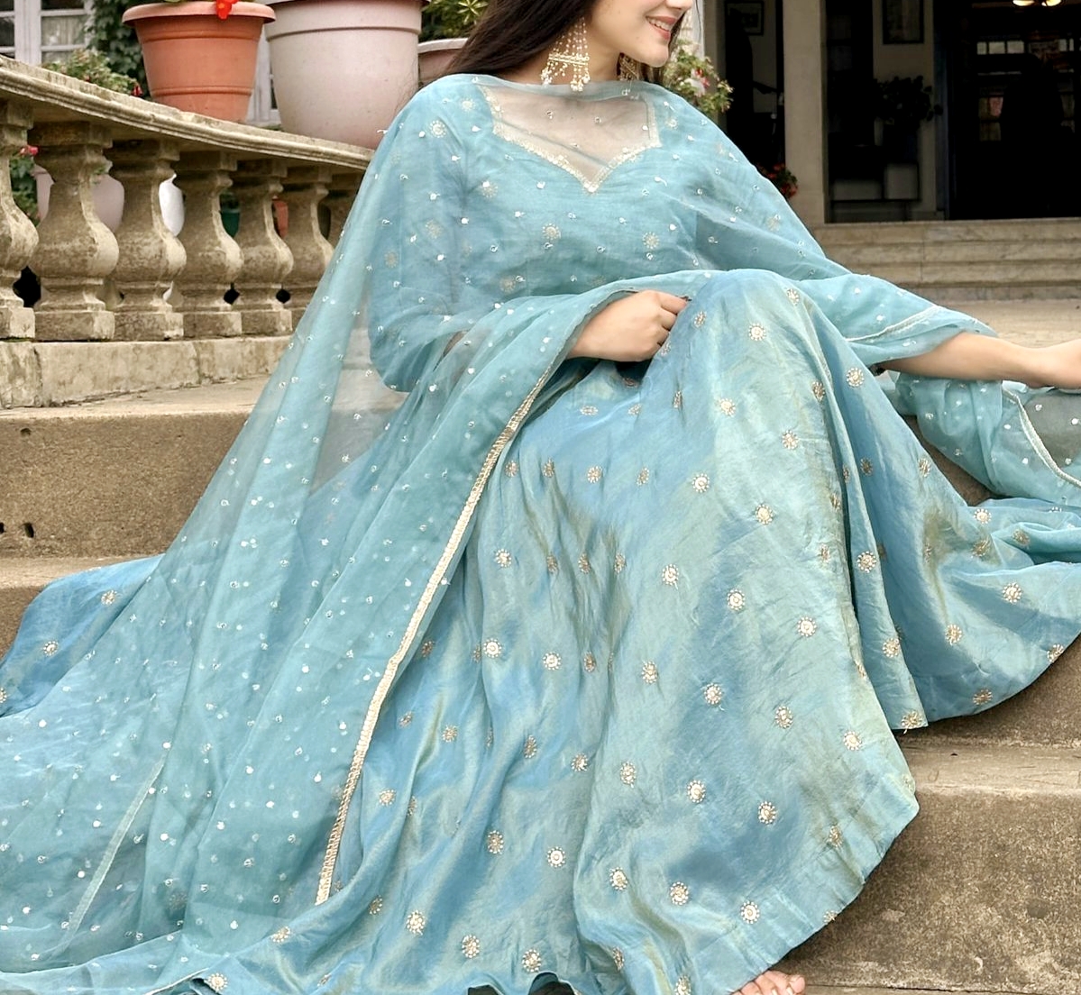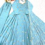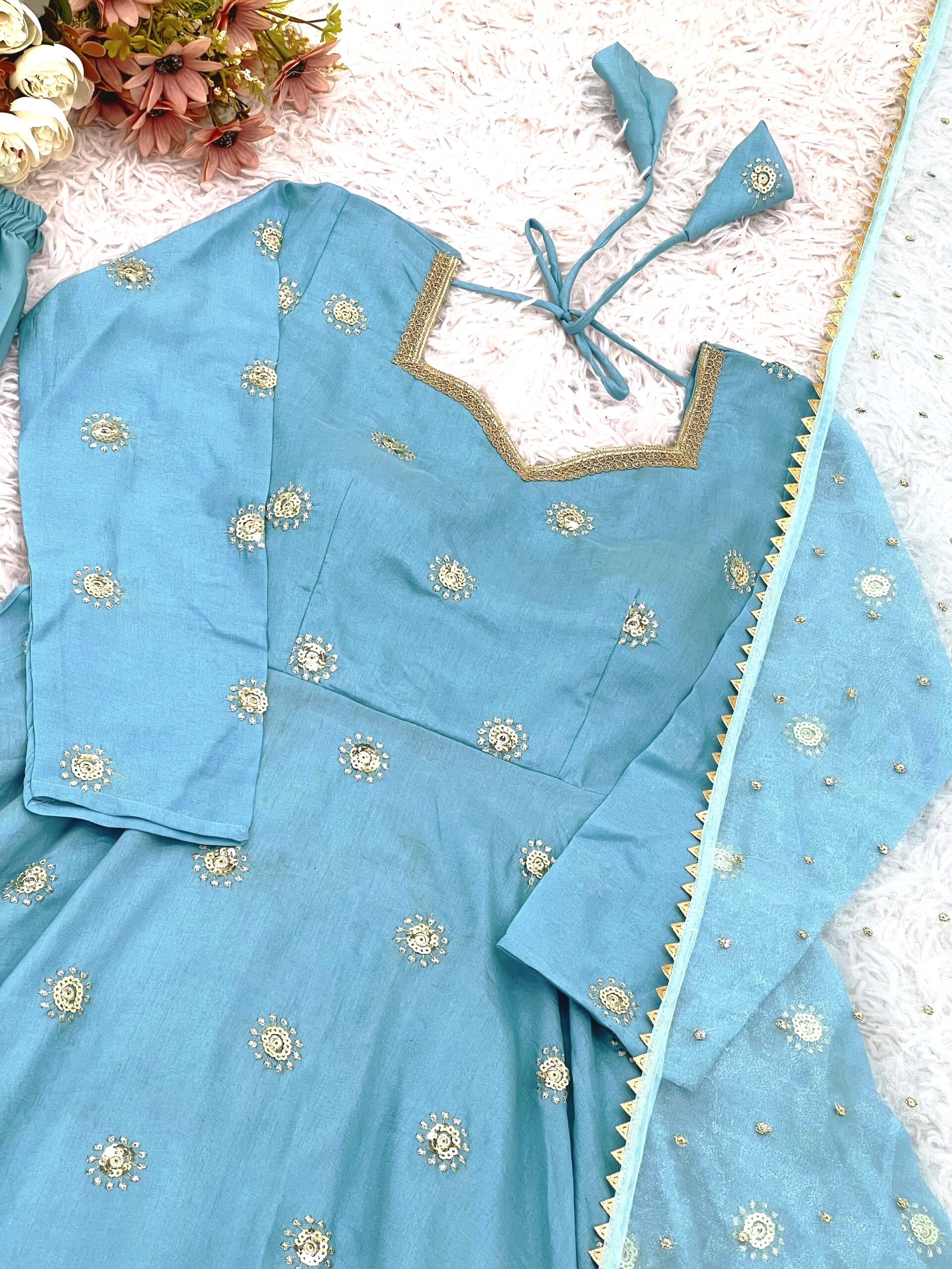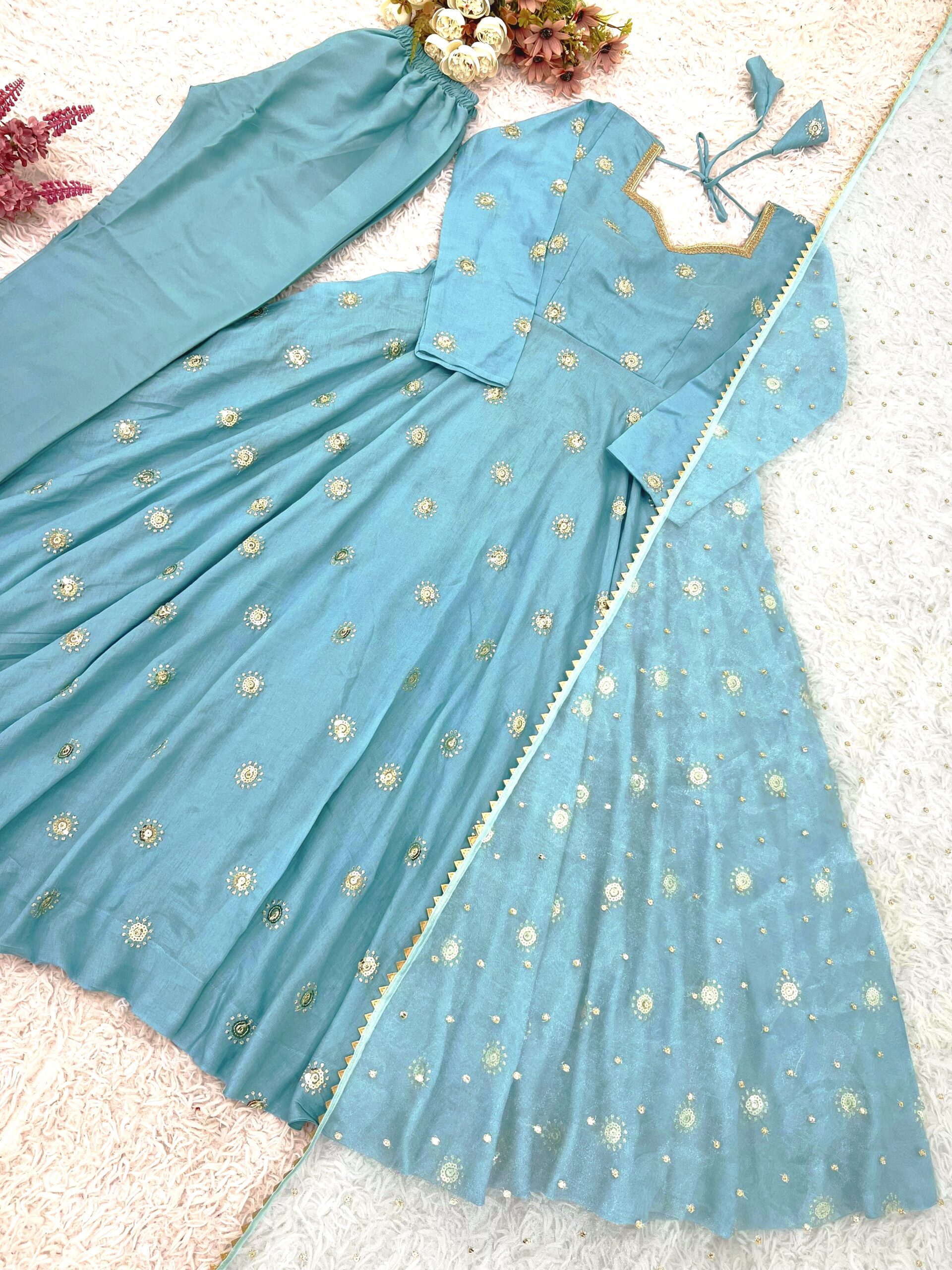 Crafted in Heavy Vichitra Silk with exquisite embroidery & sequence detailing, this fully stitched gown set is designed for graceful festive moments.