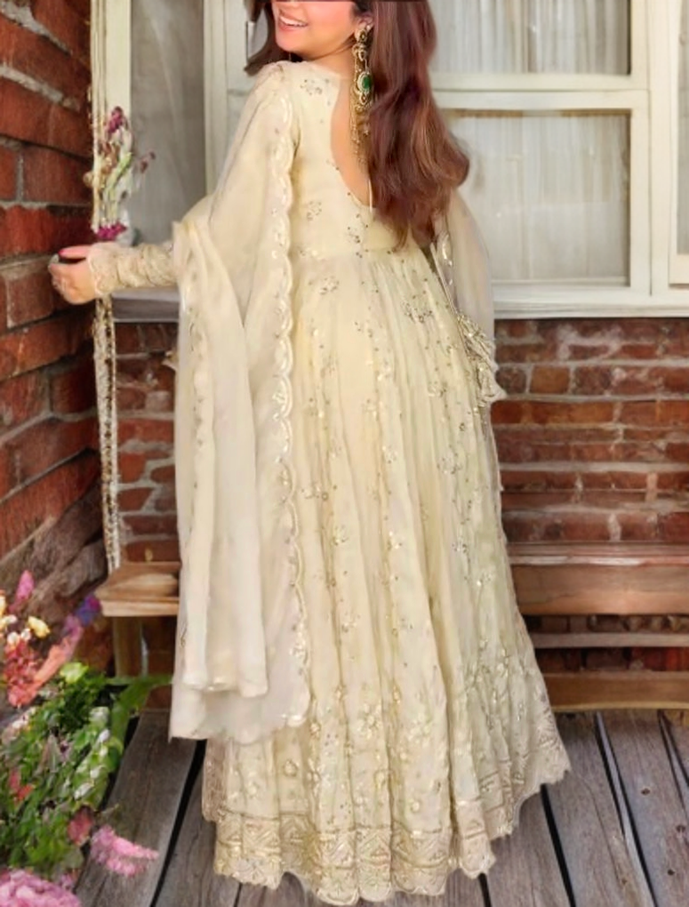 Indulge in timeless elegance with this exquisitely crafted Pure Chinon Silk Gown Set, adorned with intricate 5mm sequin embroidery and delicate rivet-moti detailing. Designed with graceful full sleeves and a statement latkan-dori, it reflects effortless sophistication.