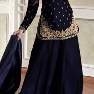 A beautifully crafted Designer 3-Piece Koti-Palazzo-Blouse Set, detailed with luxurious Sequin Embroidery, perfect for weddings & celebrations.