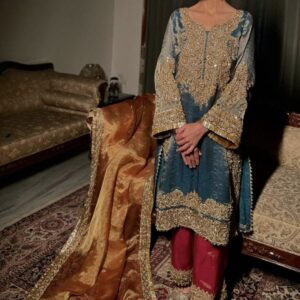A beautifully crafted Designer 3-Piece Koti-Palazzo-Blouse Set, detailed with luxurious Sequin Embroidery, perfect for weddings & celebrations.