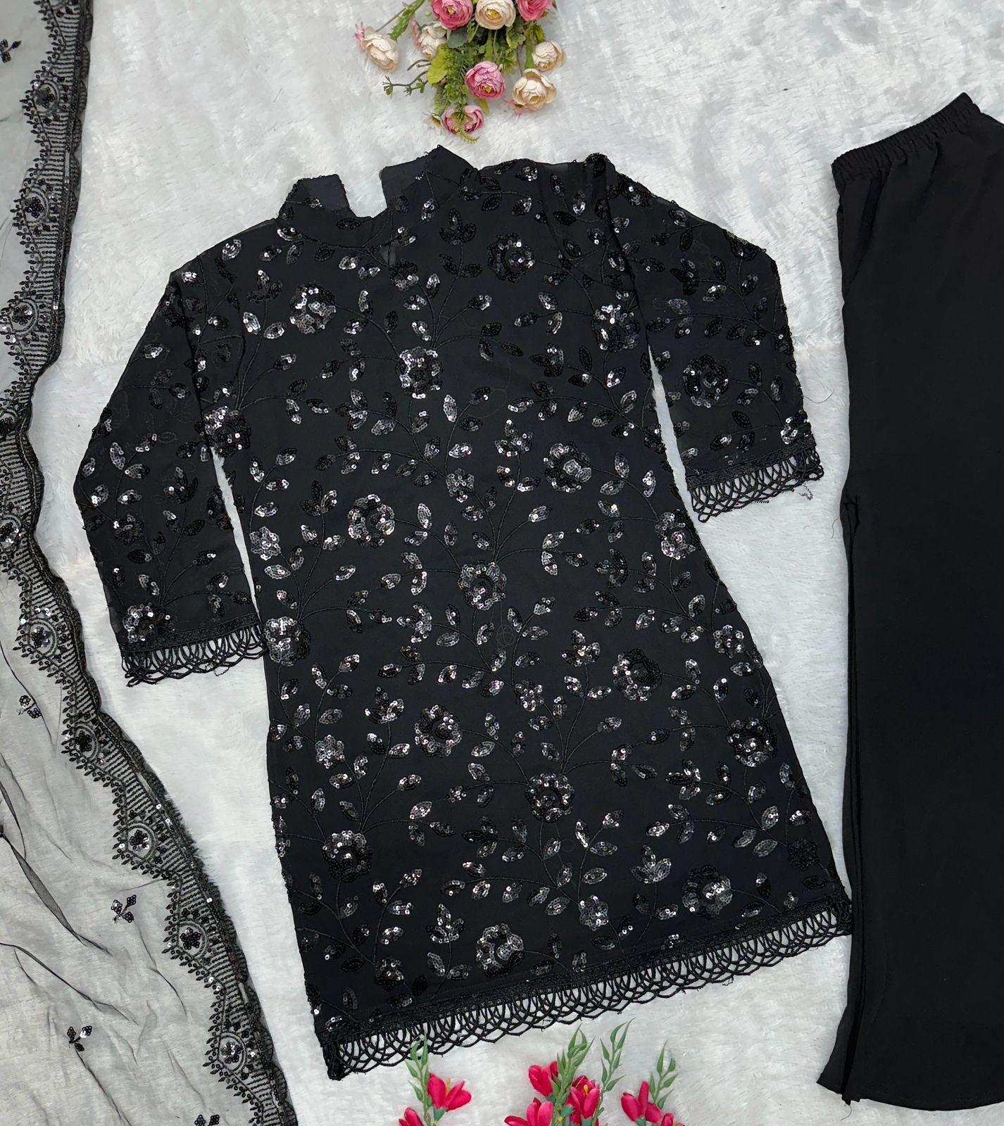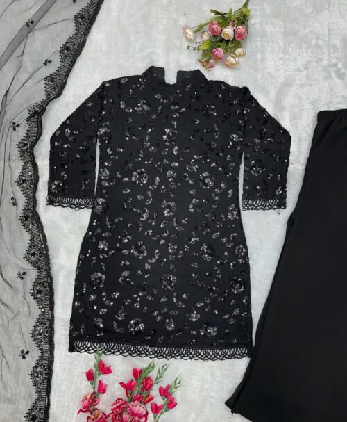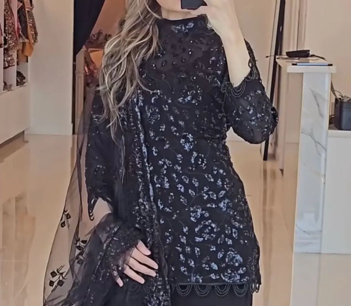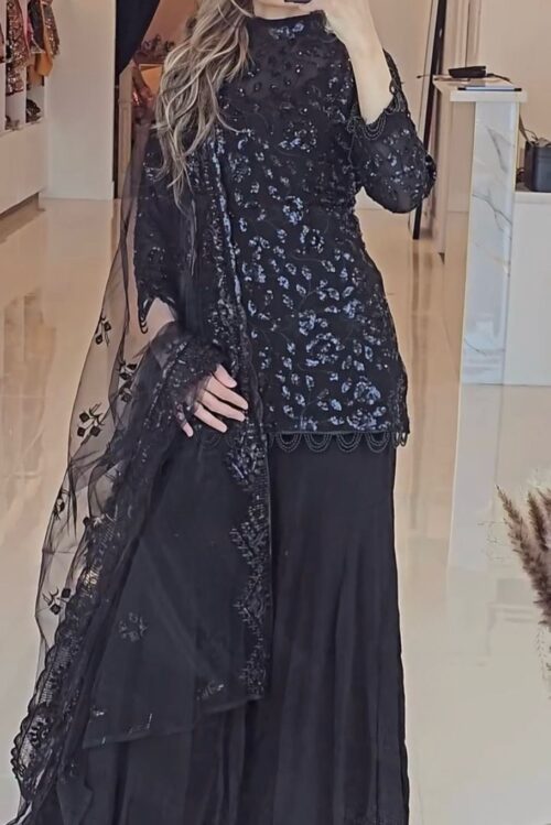 Unleash your Darker side and attitude with this bold and elegant set. Featuring a Georgette Top with intricate embroidery detail. Georgette Bottom and Net Dupatta are also included to complete your look.