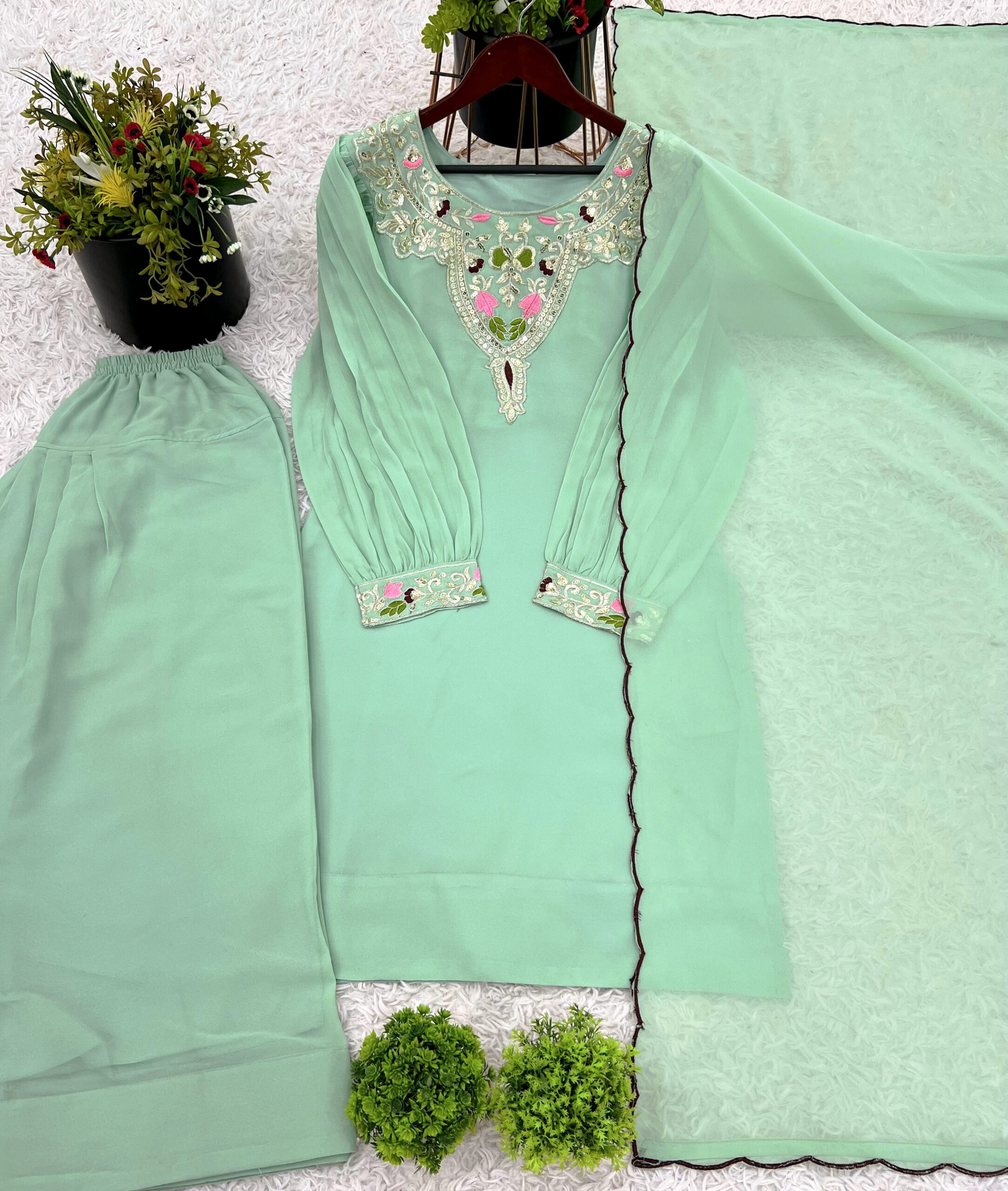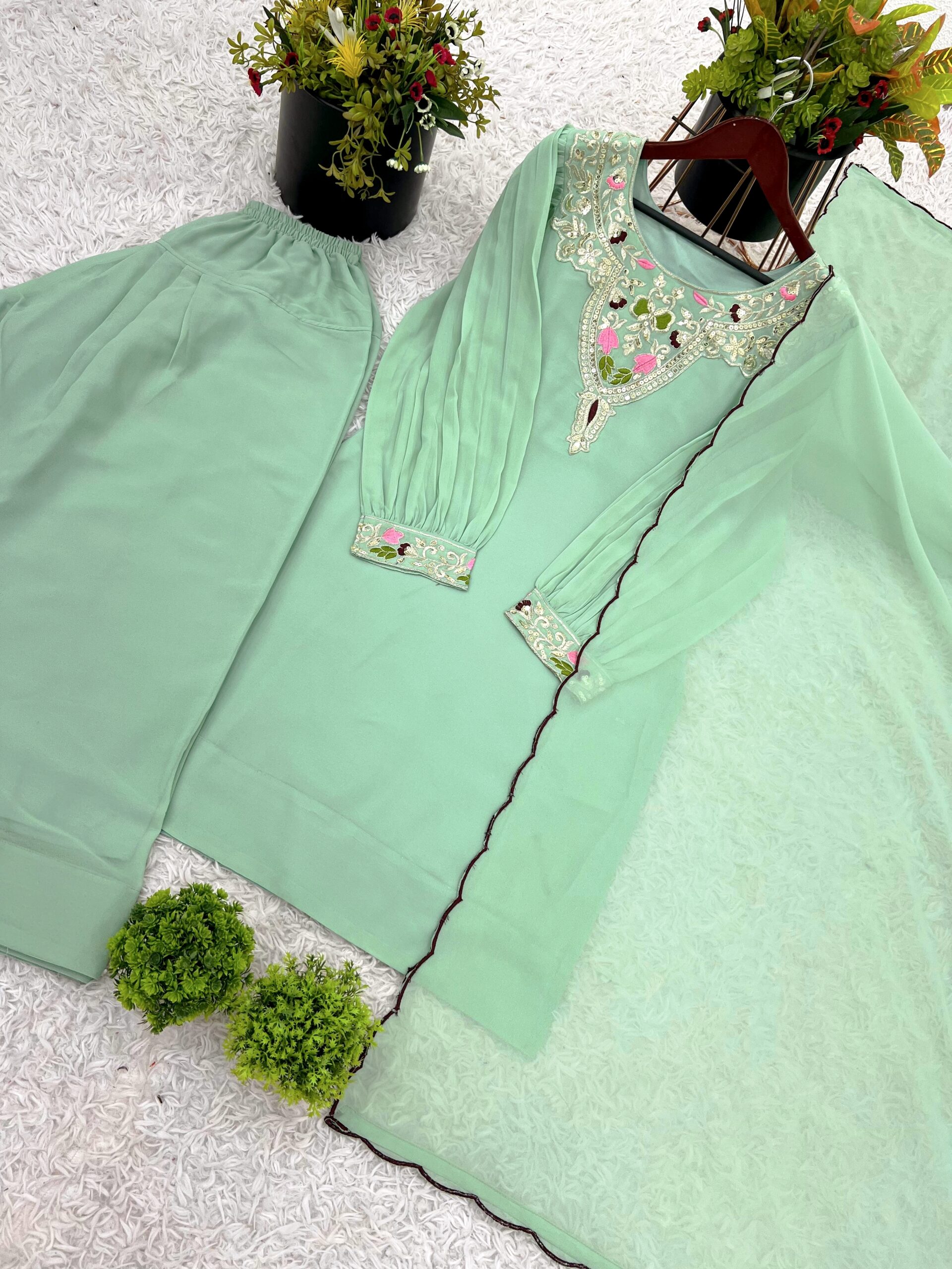 Grace your wardrobe with this premium ensemble crafted in rich Faux Georgette with 5mm Sequin Embroidery for a refined festive look.
