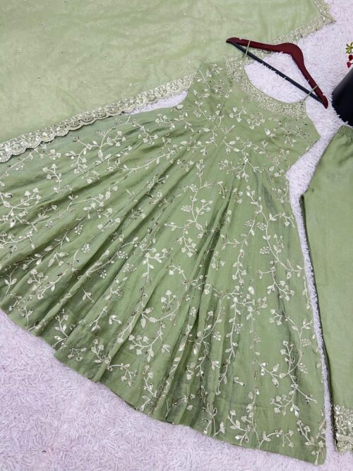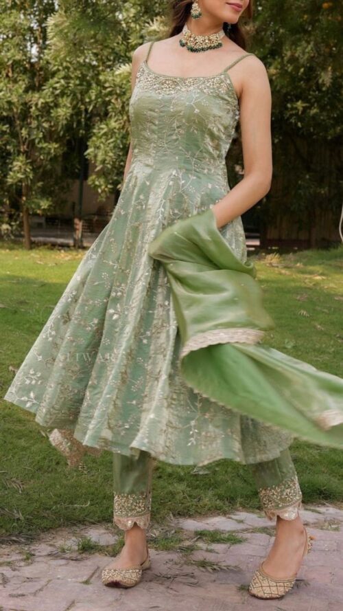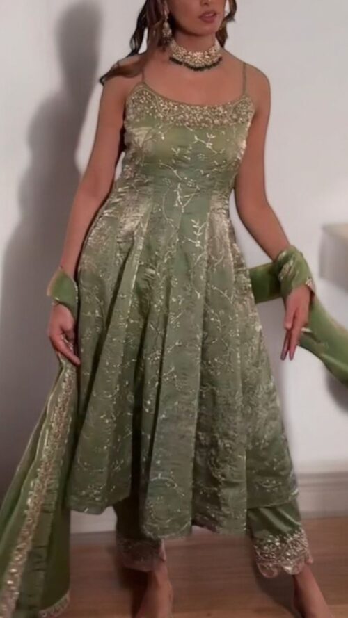 The gown’s delicate spaghetti straps and fitted bodice create a graceful silhouette, while the coordinating embroidered pants and matching dupatta complete the look with refined detail.