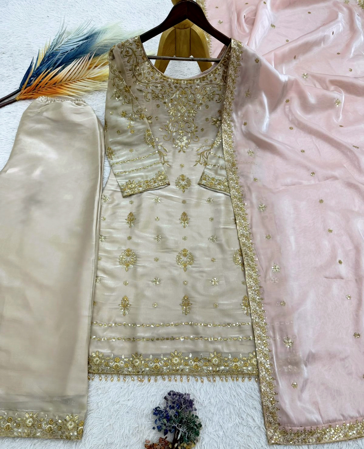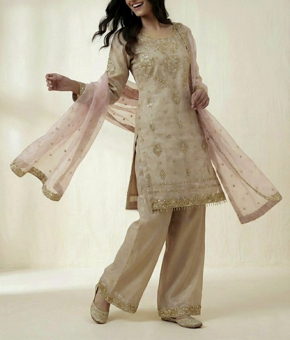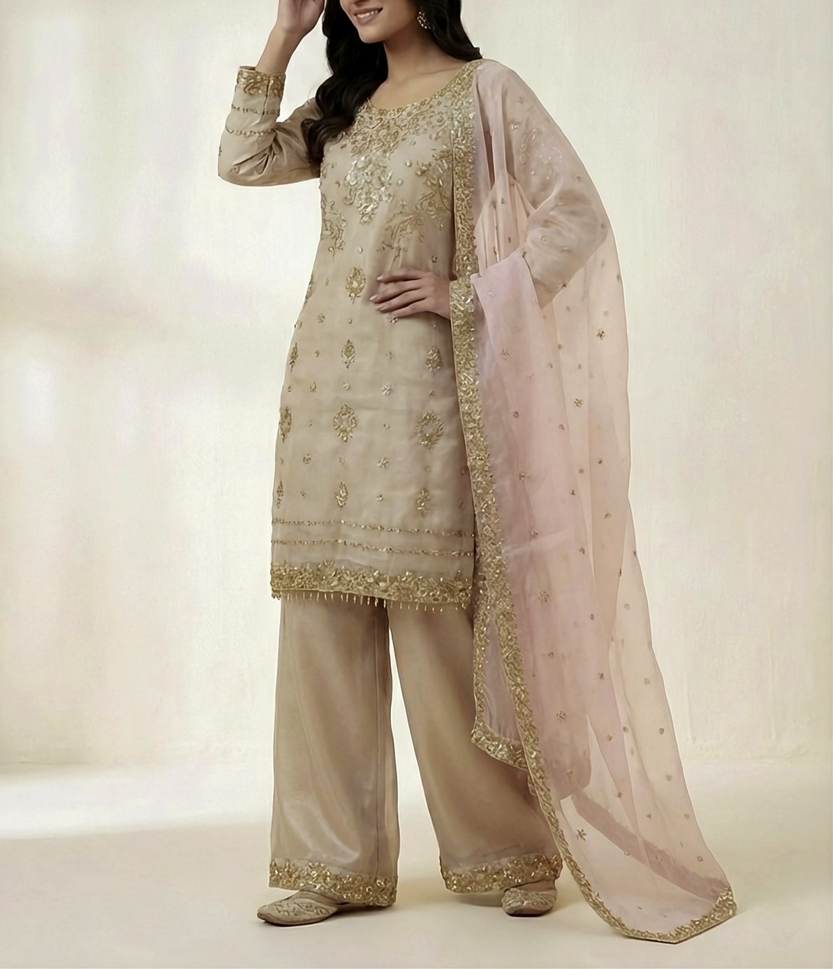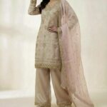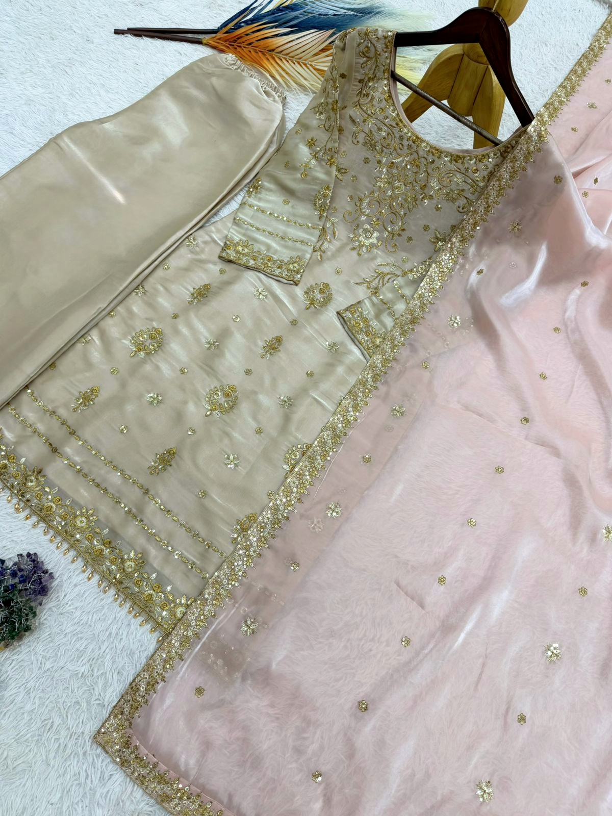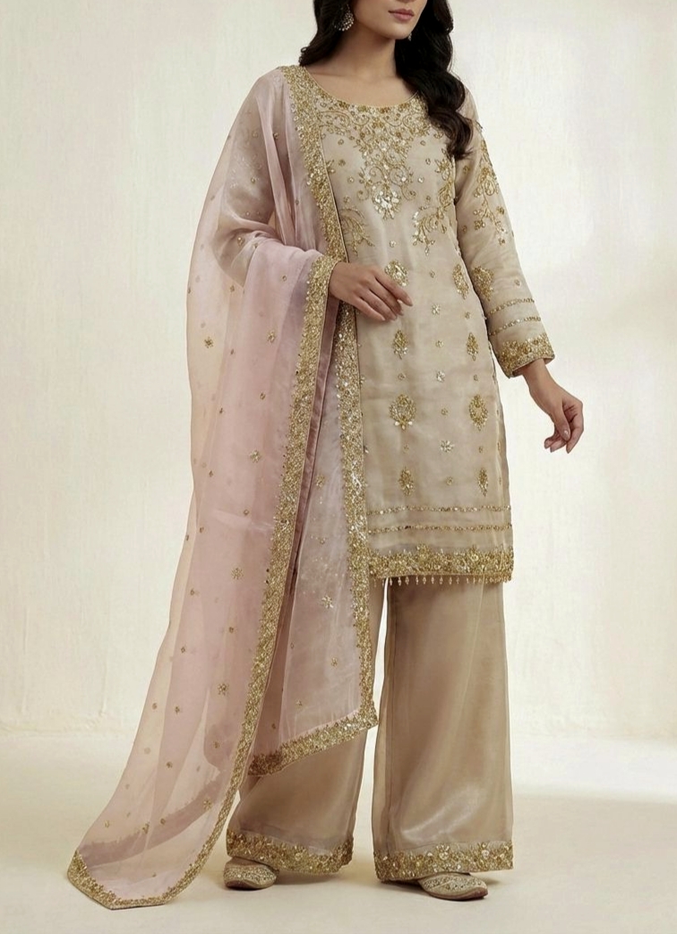 Intricately adorned with heavy embroidery & fine sequence work, this refined Topโ€“Plazzoโ€“Dupatta set reflects timeless elegance and modern grace.