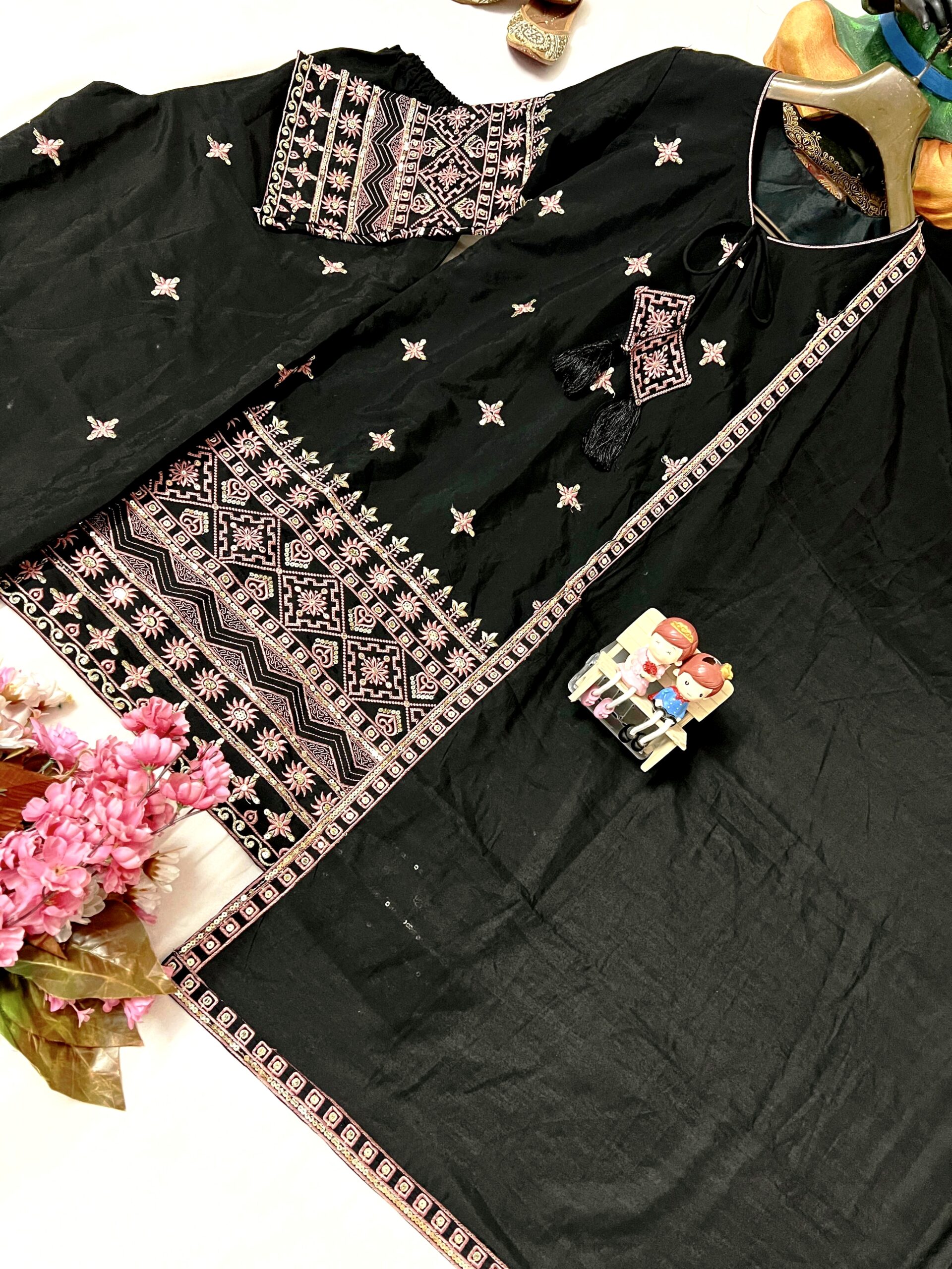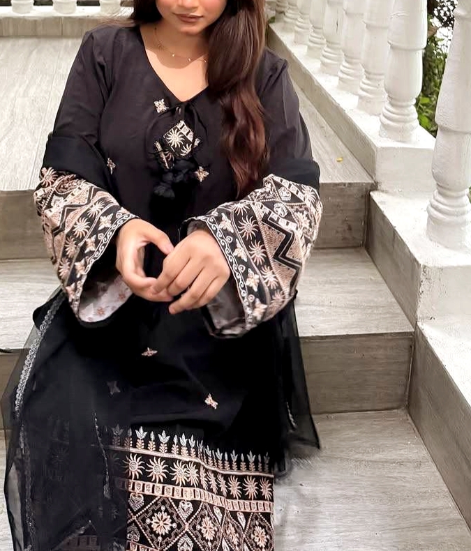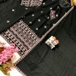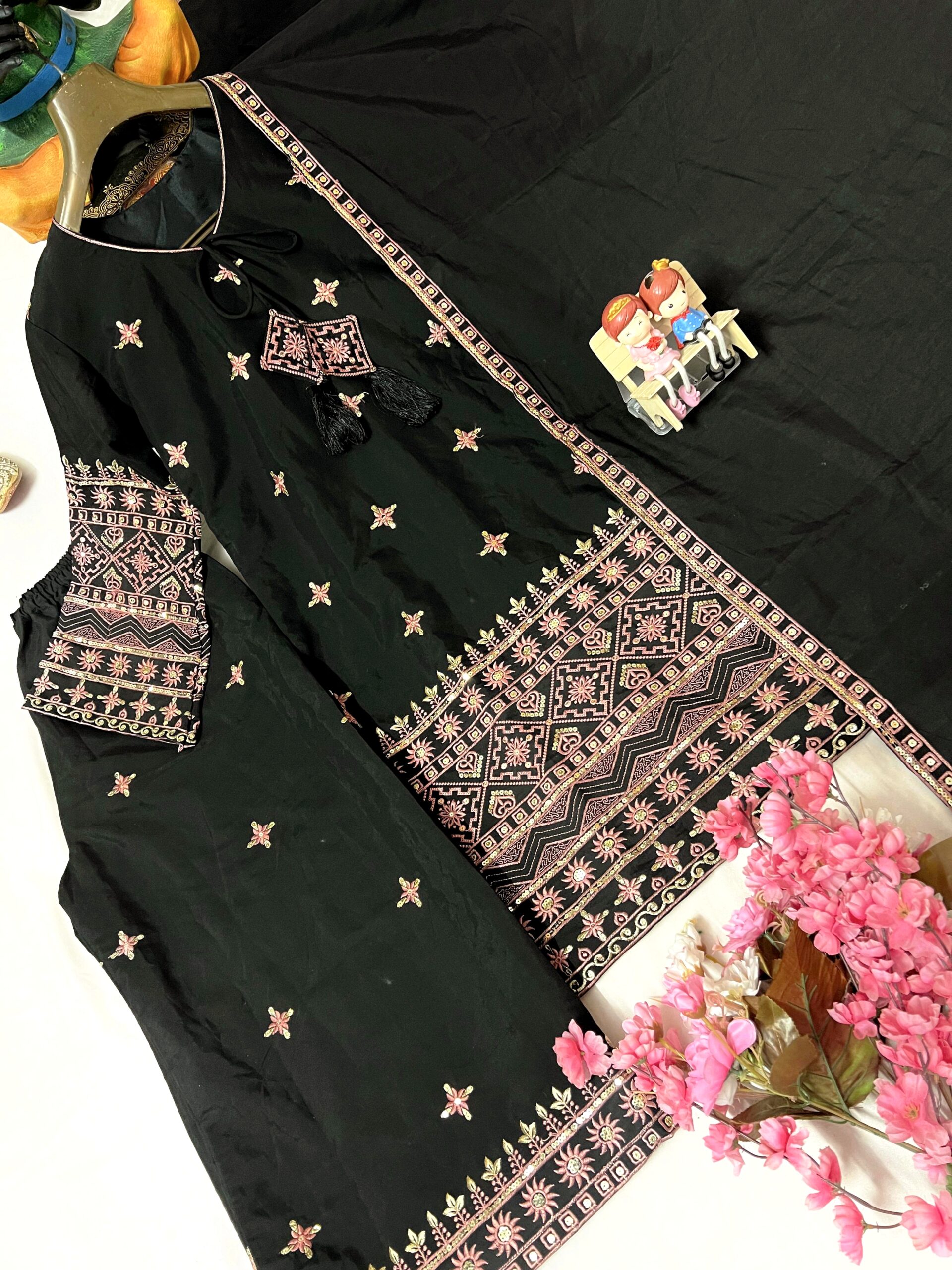 Grace your wardrobe with this premium ensemble crafted in rich Roman Silk Cotton, beautifully adorned with Thread, Zari & 5mm Sequins Embroidery for a refined festive look.