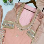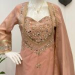 A premium festive wear set crafted in luxurious Cosmos fabric with stunning embroidery and real mirror work. Perfect blend of elegance and comfort for all occasions. It includes Top, Blouse, Palazzo and Dupatta.