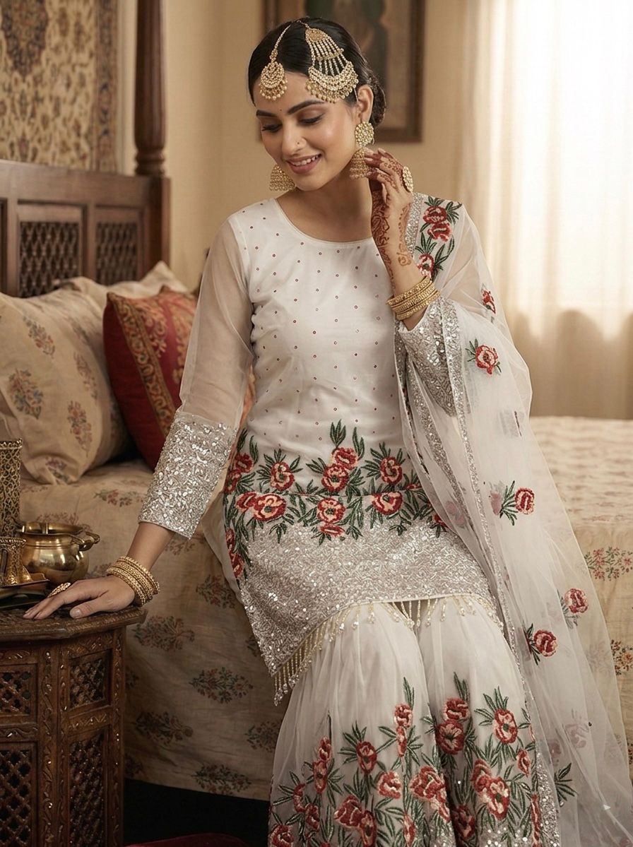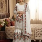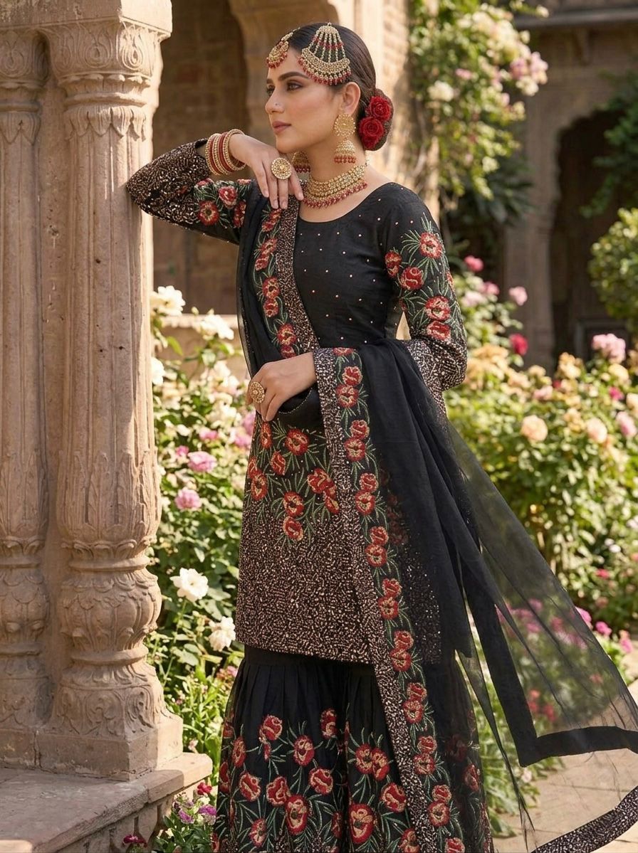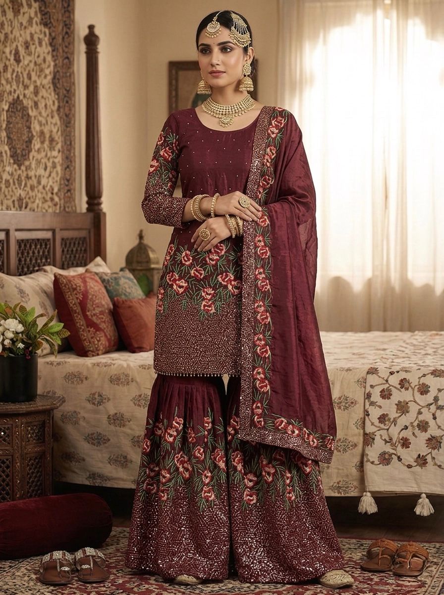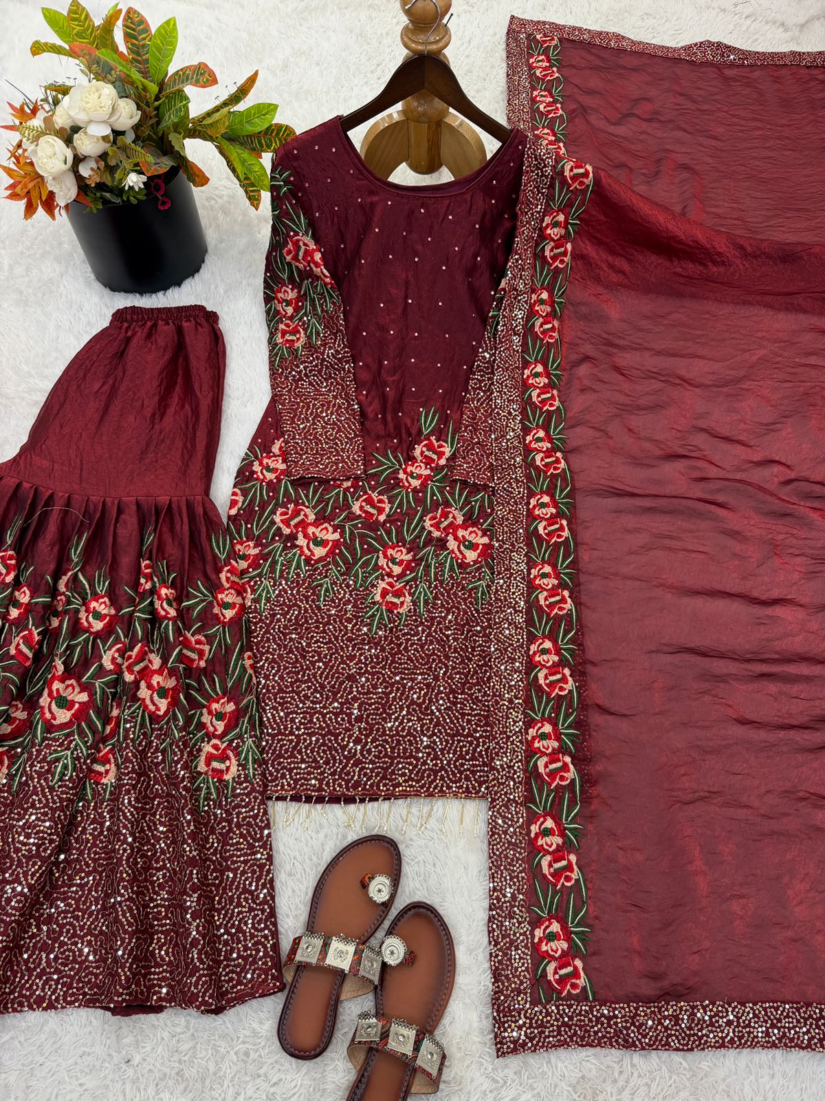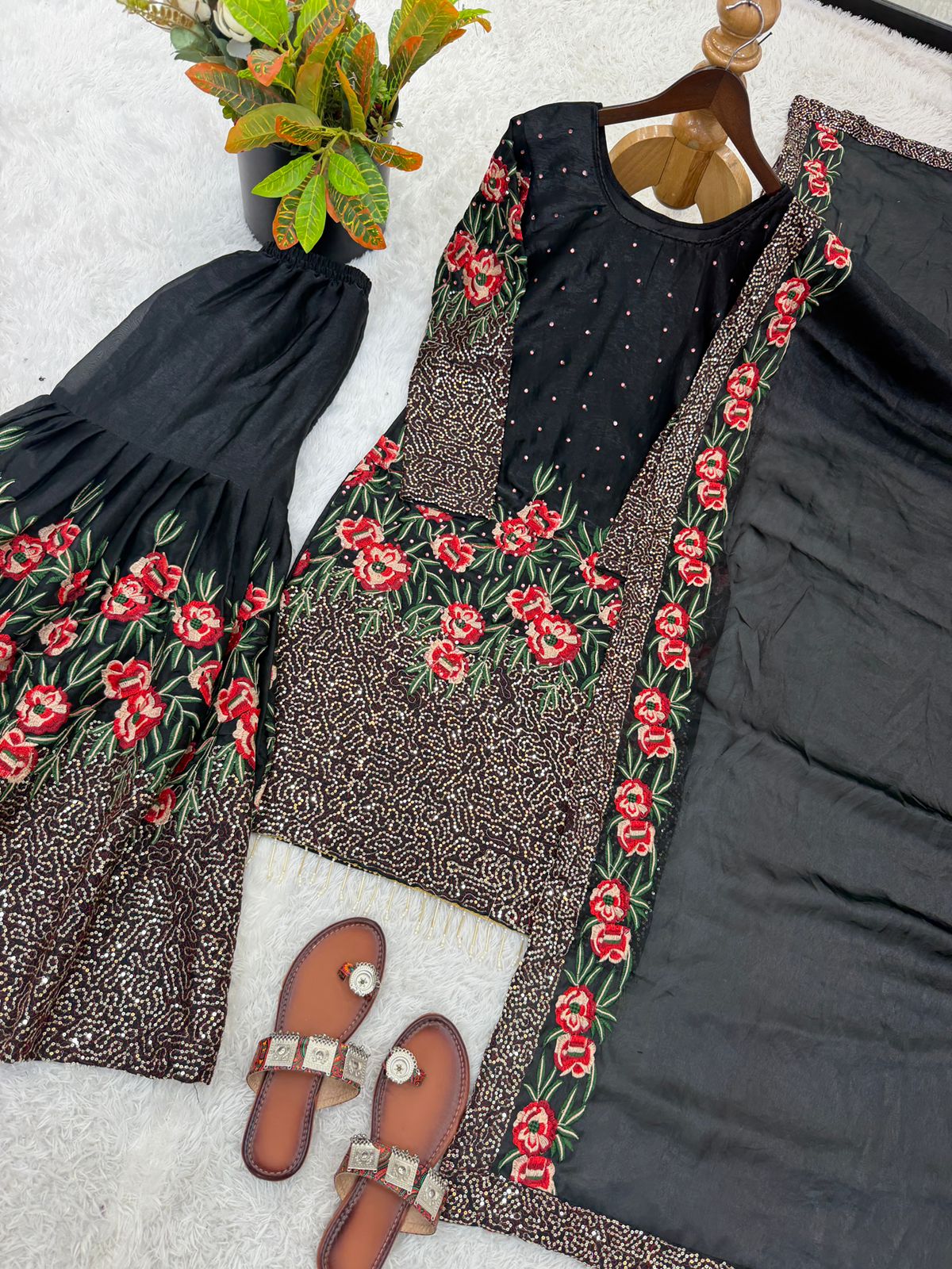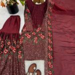 Step into festive elegance with this premium set, beautifully crafted with heavy embroidery sequence work and fine hand detailing. Fully stitched and ready to wear, this outfit is perfect for those special celebrations.