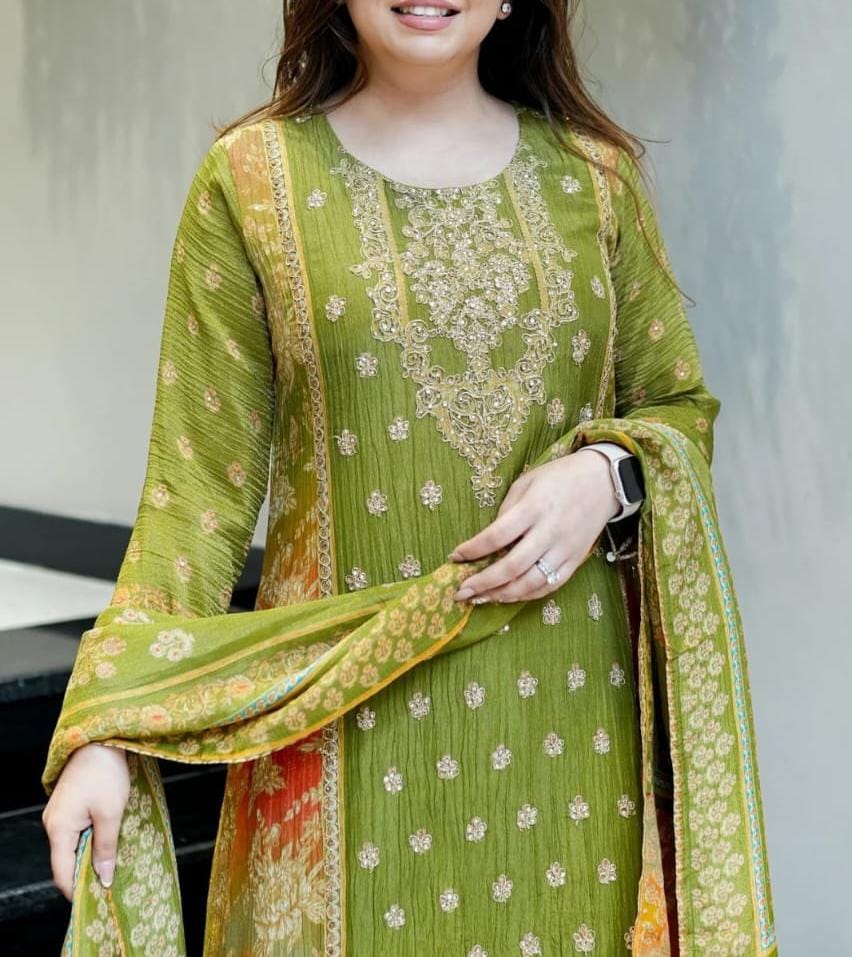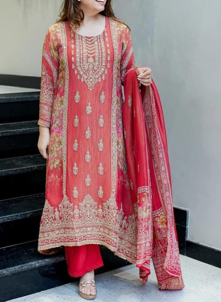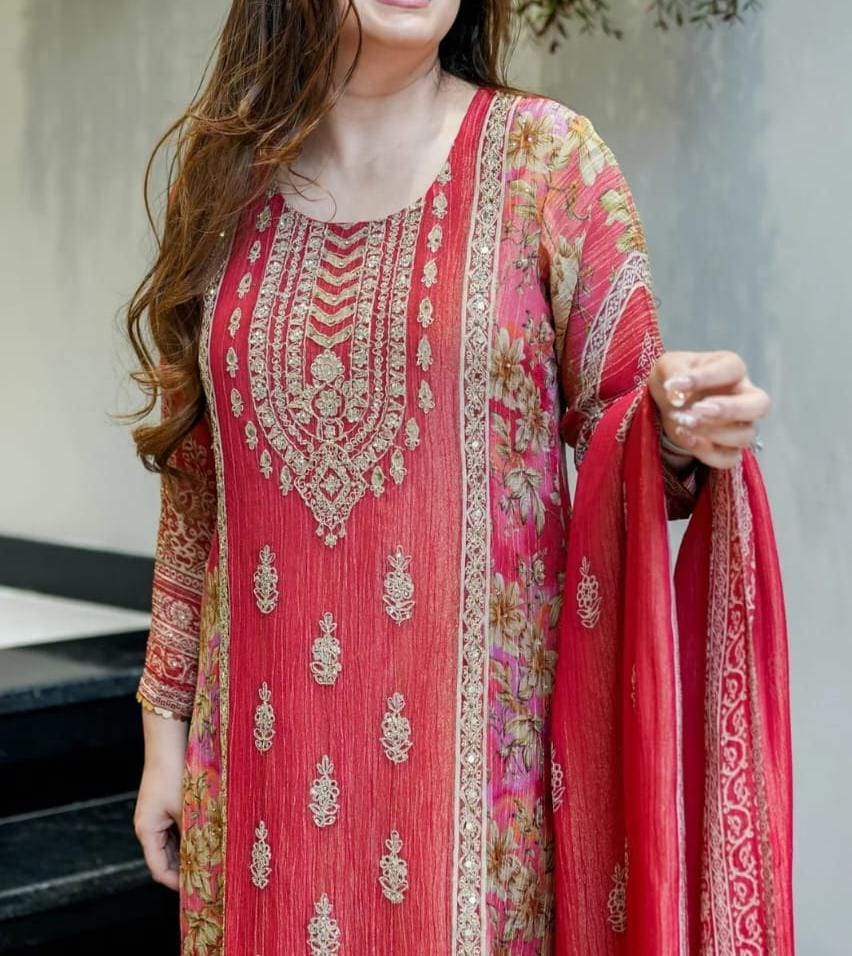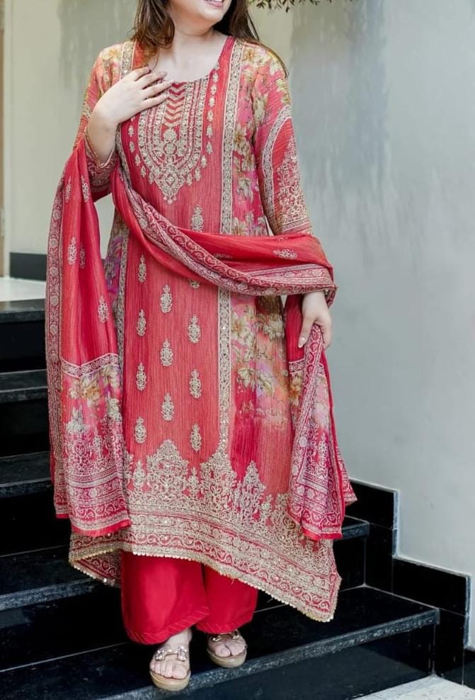 Celebrate the season with grace and charm in our 3-piece Ready-Made Kurti Set, crafted from luxurious Premium Chinon fabric. With intricate embroidery & handwork detailing and a stunning hand-designed neckline, this outfit is the perfect blend of tradition and modern style – ideal for festive and wedding occasions!