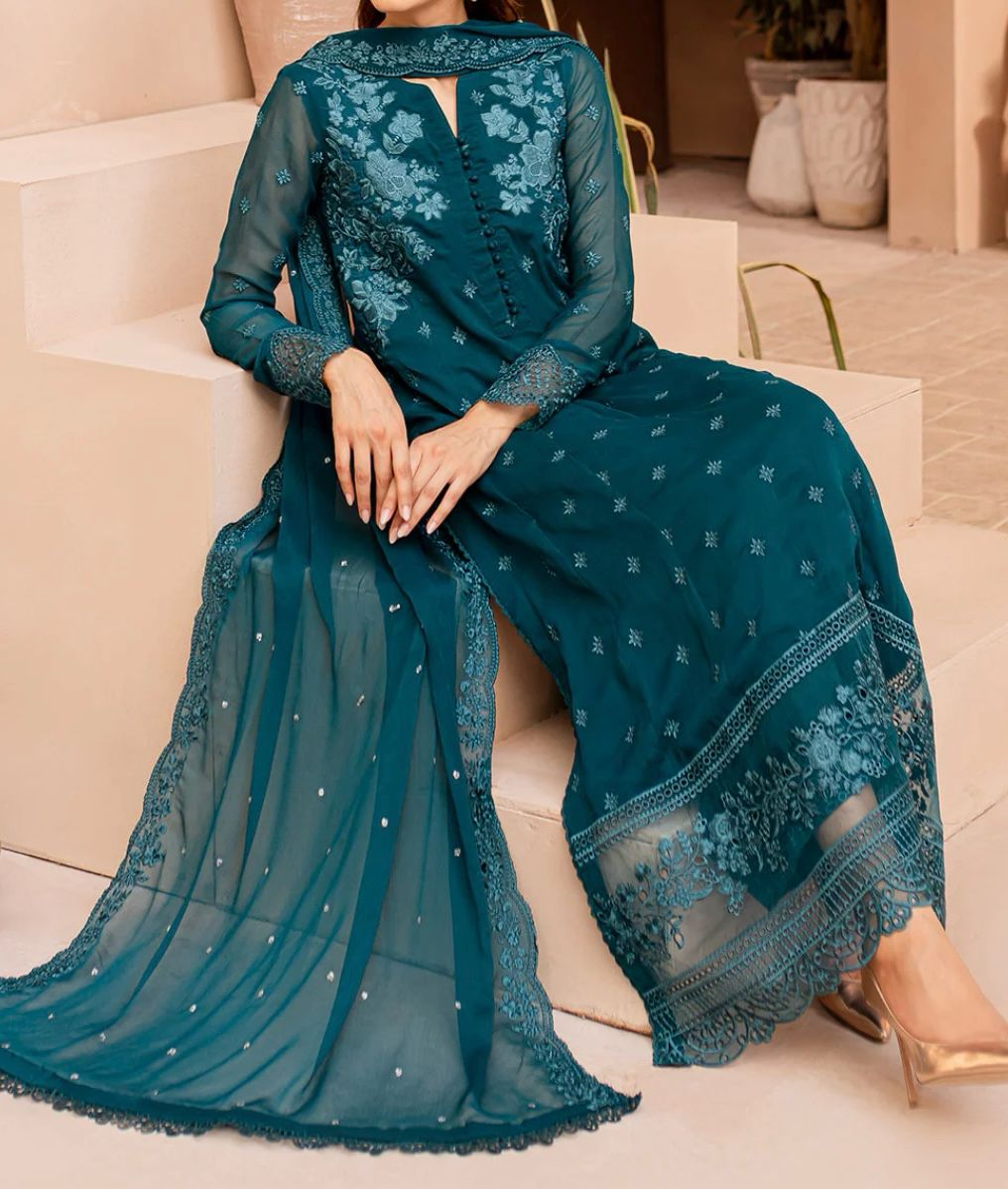 Unleash your Caribbean charm with this elegant ensemble. Featuring a Georgette Top with intricate embroidery detail. Georgette Pant and Dupatta are also included to complete your look for any occasion.