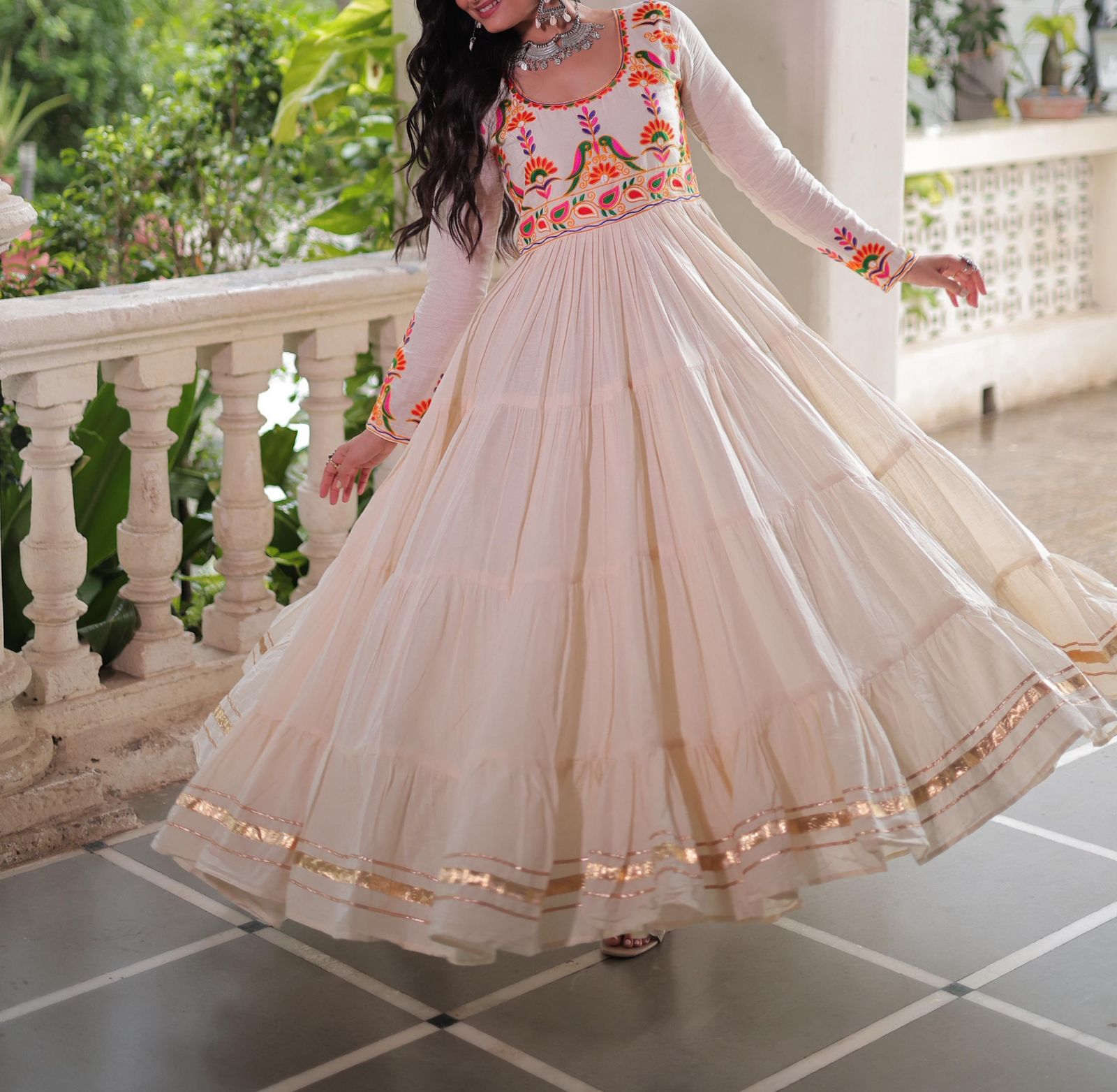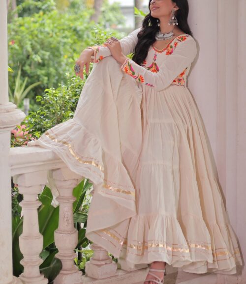 Fabric & Work: Premium Kora Cotton with Multi-Thread Embroidery & Traditional Gota Patti Work
