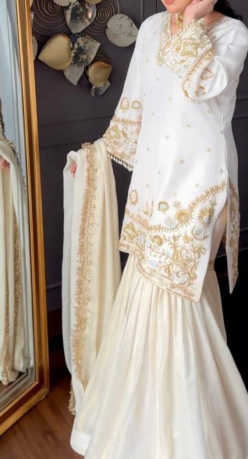 Beautiful matching dupatta made from Crepe Silk fabric with amazing lace, embroidery and sequins work.