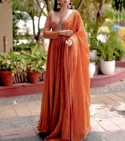 Fabric: Premium Blooming Georgette with soft Micro Cotton lining for ultimate comfort. Intricate Zari & 5 mm Sequins Embroidery, finished with a stylish fancy dori. Length is 54 inches with Full Sleeves. Flair is Up to 3 meters for that elegant swirl.