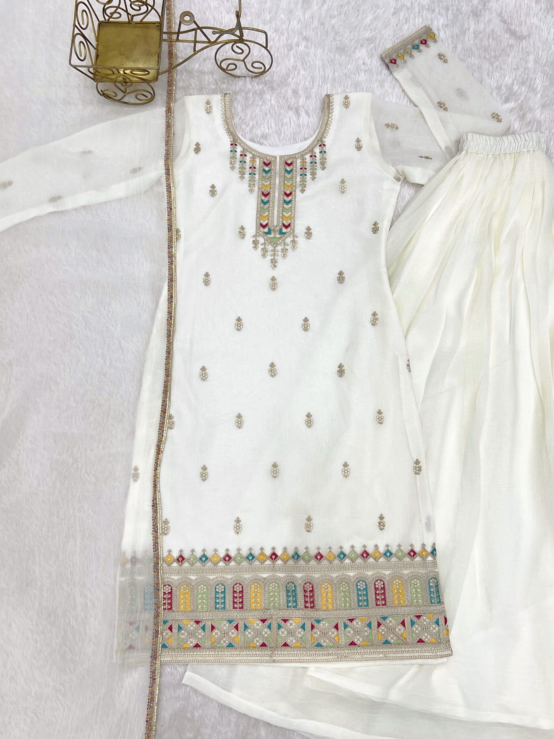 Intricate sequence, dori, thread & zari embroidery adorns the kurta, paired with a beautifully flared silk sharara and a 2.2 mtr lace-detailed dupatta β€” creating effortless grandeur with all-day comfort.