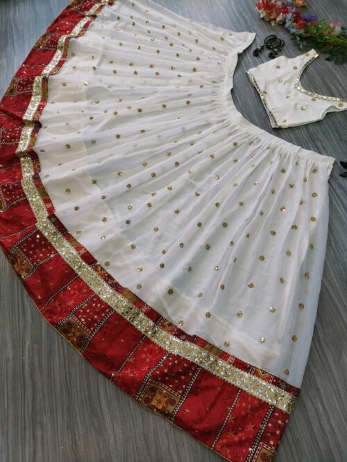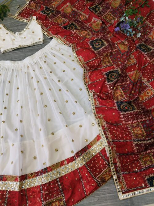 Lehenga made from Premium Georgette. Stunning heavy sequins, digital print, and elegant foil mirror work and heavy cancan. Flair is up to 3.5 meters. Semi-stitched (fits multiple sizes)