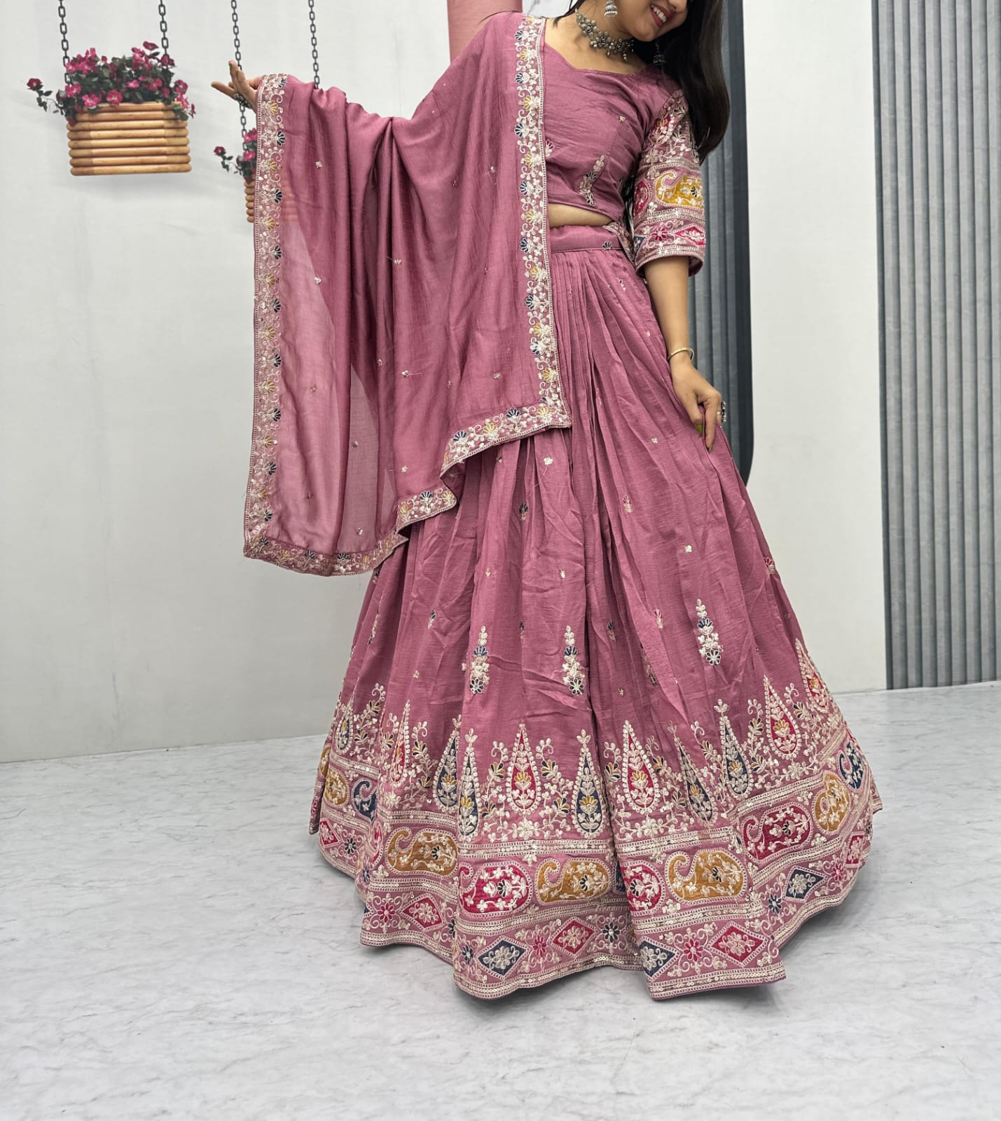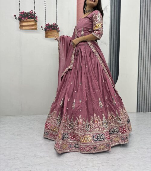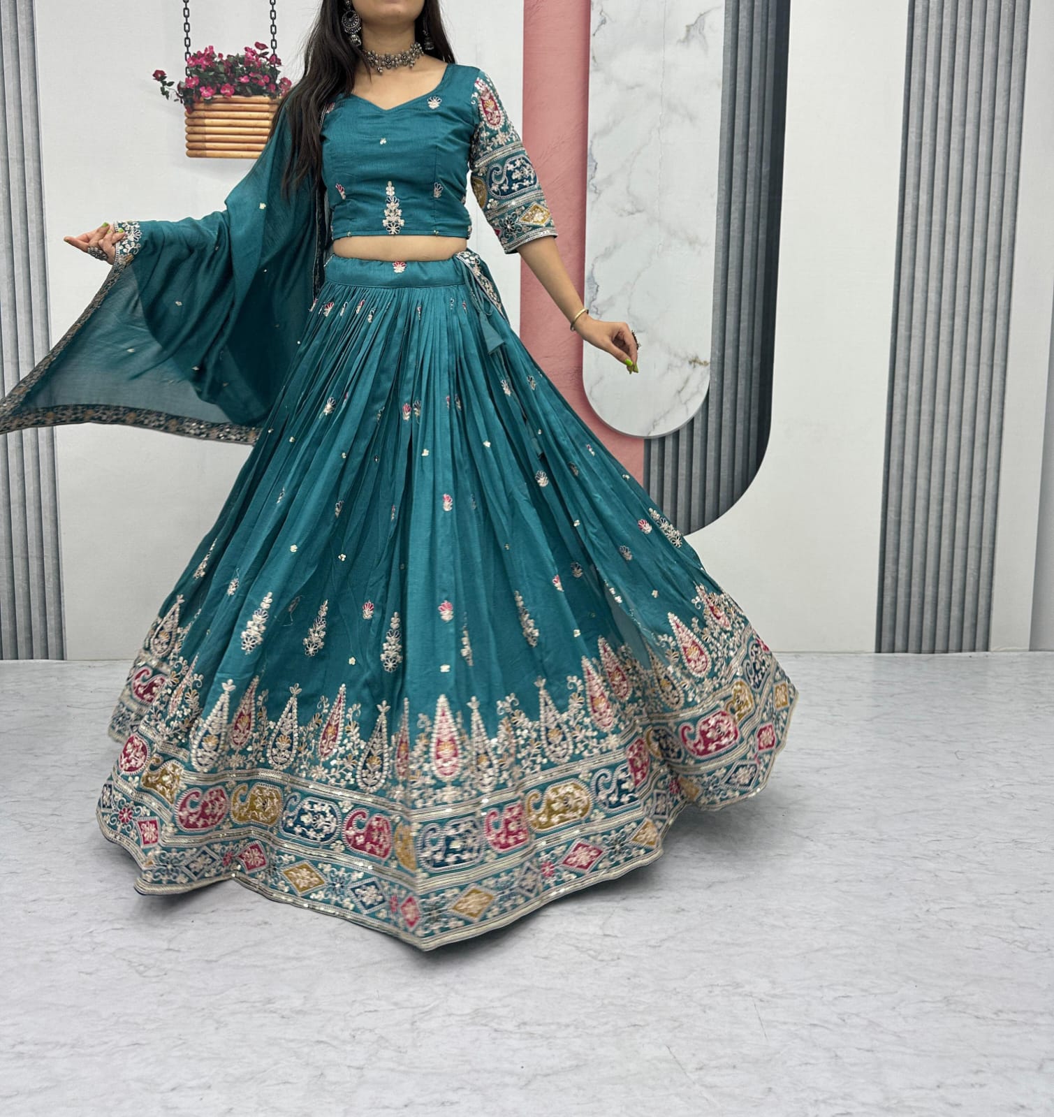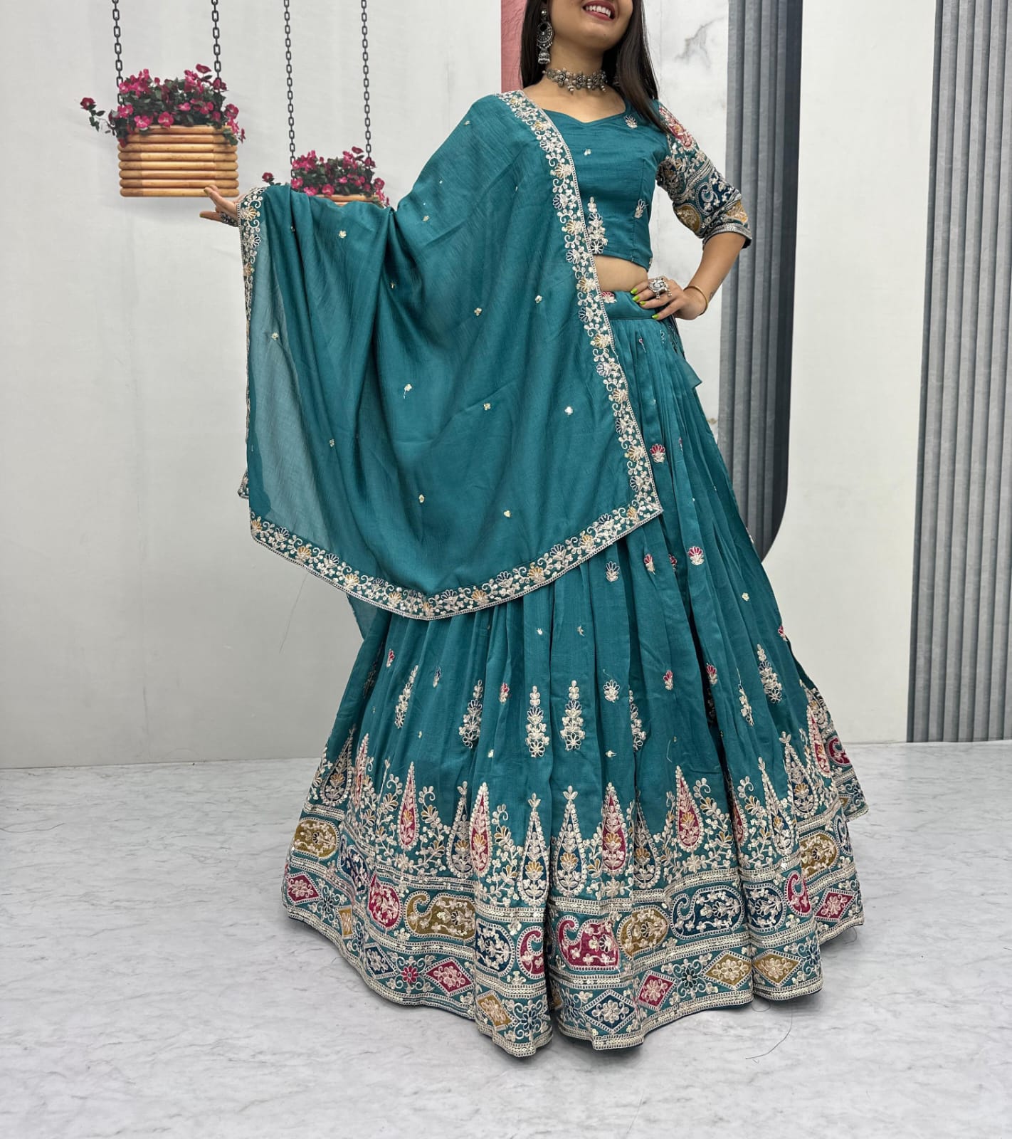 Lehenga – Crafted from Pure Vichitra Fabric. Adorned with Heavy Embroidery, Coding Sequence & Thread Work. Enhanced with stylish Latkan Dori. Comfortable Micro Cotton Inner Lining. Grand flair up to 3.50 meters. Includes Attached Canvas Patta with Cancan for that perfect shape.