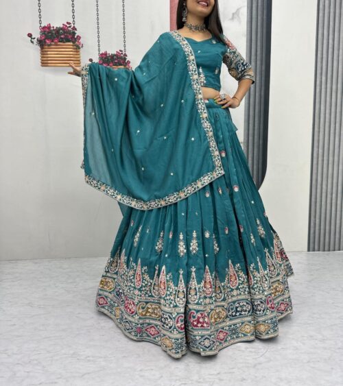 Choli – Made from Pure Vichitra Fabric. Embellished with Heavy Embroidery, Coding Sequence & Thread Work. Soft and breathable Micro Cotton Lining.